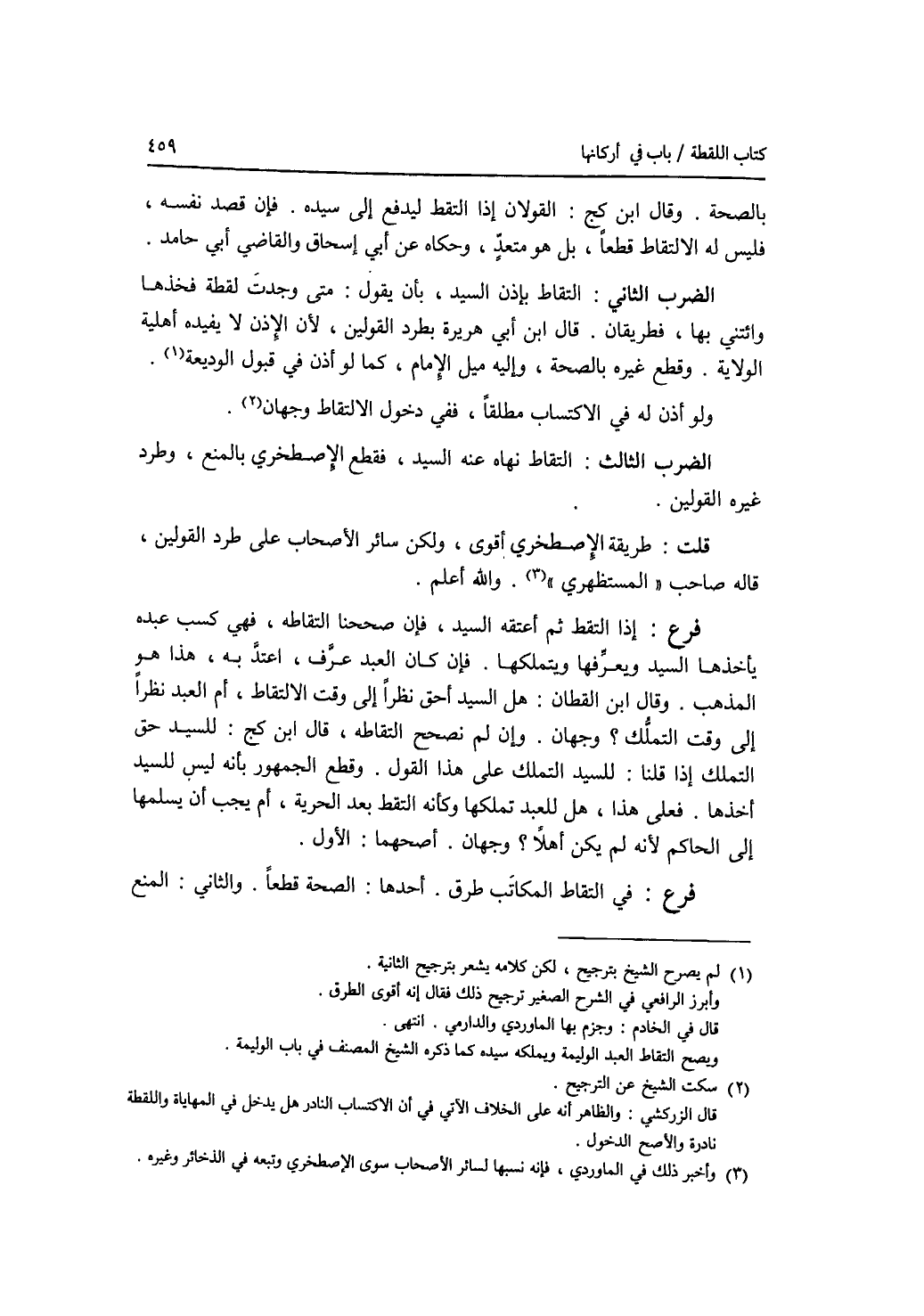 بالصحة. وقال ابن كج: القولان إذا التقط ليدفع إلى سيده. فإن قصد نفسه، فليس له الالتقاط قطعا، بل هو متعد، وحكاه عن أبي إسحق والقاضي أبي حامد. الضرب الثاني: التقاط بإذن السيد، بأن يقول: متى وجدت لقطة فخذها وائتني بها، فطريقان. قال ابن أبي هريرة بطرد القولين، لان الاذن لا يفيده أهلية الولاية. وقطع غيره بالصحة، وإليه ميل الامام، كما لو أذن في قبول الوديعة ولو أذن له في الاكتساب مطلقا، ففي دخول الالتقاط وجهان. الضرب الثالث: التقاط نهاه عنه السيد، فقطع الاصطخري بالمنع، وطرد غيره القولين. قلت: طريقة الاصطخري أقوى، ولكن سائر الاصحاب على طرد القولين، قاله صاحب المستظهري. والله أعلم فرع إذا التقط ثم أعتقه السيد، فإن صححنا التقاطه، فهي كسب عبده يأخذها السيد ويعرفها ويتملكها. فإن كان العبد عرف، اعتد به، هذا هو المذهب. وقال ابن القطان: هل السيد أحق نظرا إلى وقت الالتقاط، أم العبد نظرا إلي وقت التملك ؟ وجهان. وإن لم نصحح التقاطه، قال ابن كج: للسيد حق التملك إذا قلنا: للسيد التملك على هذا القول. وقطع الجمهور بأنه ليس للسيد أخذها. فعلى هذا، هل للعبد تملكها وكأنه التقط بعد الحرية، أم يجب أن يسلمها إلى الحاكم لانه لم يكن أهلا ؟ وجهان. أصحهما: الاول. فرع في التقاط المكاتب طرق. أحدها: الصحة قطعا. والثاني: المنع