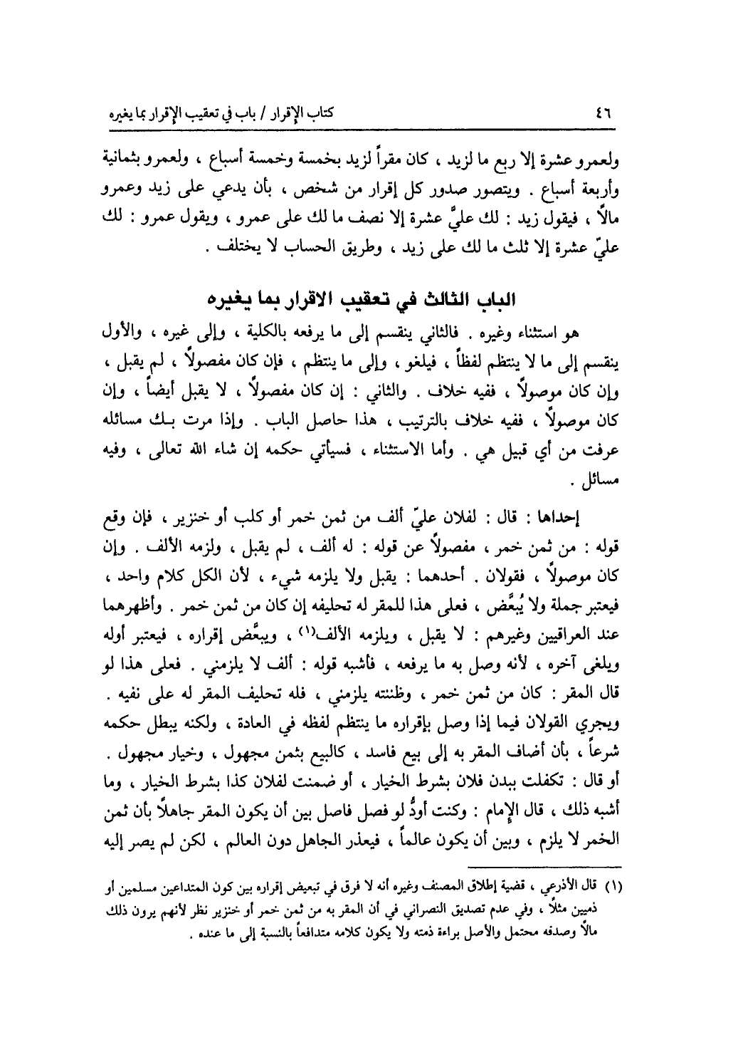 الباب الثالث : في تعقيب الاقرار بما يغيره هو استثناء وغيره. فالثاني ينقسم إلى ما يرفعه بالكلية، وإلى غيره، والاول ينقسم إلى ما لا ينتظم لفظا، فيلغو، وإلى ما ينتظم، فإن كان مفصولا، لم يقبل، وإن كان موصولا، ففيه خلاف. والثاني: إن كان مفصولا، لا يقبل أيضا، وإن كان موصولا، ففيه خلاف بالترتيب، هذا حاصل الباب. وإذا مرت بك مسائله عرفت من أي قبيل هي. وأما الاستثناء، فسيأتي حكمه إن شاء الله تعالى، وفيه مسائل. إحداها: قال: لفلان علي ألف من ثمن خمرأو كلب أو خنزير، فإن وقع قوله: من ثمن خمر، مفصولا عن قوله: له ألف، لم يقبل، ولزمه الالف. وإن كان موصولا، فقولان. أحدهما: يقبل ولا يلزمه شئ، لان الكل كلام واحد، فيعتبر جملة ولا يبعض، فعلى هذا للمقر له تحليفه إن كان من ثم خمر. وأظهرهما عند العراقيين وغيرهم: لا يقبل، ويلزمه الالف، ويبعض إقراره فيعتبر أوله ويلغى آخره، لانه وصل به ما يرفعه، فأشبه قوله: ألف لا يلزمني. فعلى هذا لو قال المقر: كان من ثمن خمر، وظننته يلزمني، فله تحليف المقر له على نفيه. ويجري القولان فيما إذا وصل بإقراره ما ينتظم لفظه في العادة، ولكنه يبطل حكمه شرعا، بأن أضاف المقر به إلى بيع فاسد، كالبيع بثمن مجهول، وخيار مجهول. أو قال: تكفلت ببدن فلان بشرط الخيار، أو ضمنت لفلان كذا بشرط الخيار، وما أشبه ذلك، قال الامام: وكنت أود لو فصل فاصل بين أن يكون المقر جاهلا بأن ثمن الخمر لا يلزم، وبين أن يكون عالما، فيعذر الجاهل دون العالم، لكن لم يصر إليه