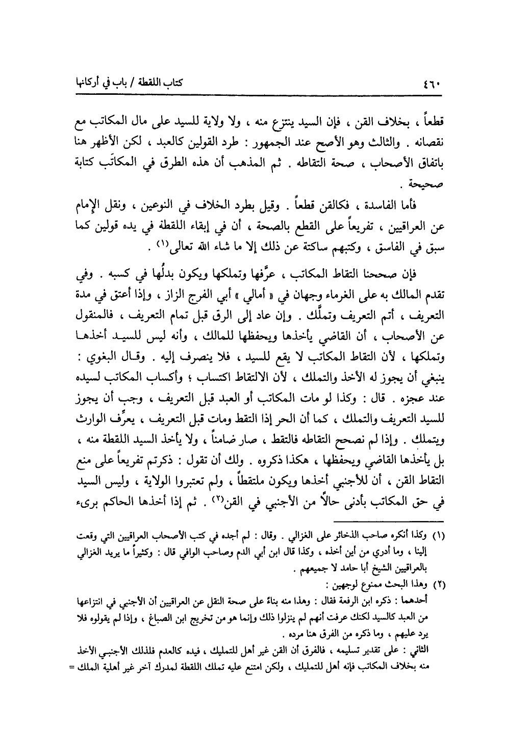 قطعا، بخلاف القن، فإن السيد ينتزع منه، ولا ولاية للسيد على مال المكاتب مع نقصانه. والثالث وهو الاصح عند الجمهور: طرد القولين كالعبد، لكن الاظهر هنا باتفاق الاصحاب، صحة التقاطه. ثم المذهب أن هذه الطرق في المكاتب كتابة صحيحة. فأما الفاسدة، فكالقن قطعا. وقيل بطرد الخلاف في النوعين، ونقل الامام عن العراقيين، تفريعا على القطع بالصحة، أن في إبقاء اللقطة في يده قولين كما سبق في الفاسق، وكتبهم ساكتة عن ذلك إلا ما شاء الله تعالى. فإن صححنا التقاط المكاتب، عرفها وتملكها ويكون بدلها في كسبه. وفي تقدم المالك به على الغرماء وجهان في أمالي أبي الفرج الزاز. وإذا أعتق في مدة التعريف، أتم التعريف وتملك. وإن عاد إلى الرق قبل تمام التعريف، فالمنقول عن الاصحاب، أن القاضي يأخذها ويحفظها للمالك، وأنه ليس للسيد أخذها وتملكها، لان التقاط المكاتب لا يقع للسيد، فلا ينصرف إليه. وقال البغوي: ينبغي أن يجوز له الاخذ والتملك، لان الالتقاط اكتساب وأكساب المكاتب لسيده عند عجزه. قال: وكذا لو مات المكاتب أو العبد قبل التعريف، وجب أن يجوز للسيد التعريف والتملك، كما أن الحر إذا التقط ومات قبل التعريف، يعرف الوارث ويتملك. وإذا لم نصحح التقاطه فالتقط، صار ضامنا، ولا يأخذ السيد اللقطة منه، بل يأخذها القاضي ويحفظها، هكذا ذكروه. ولك أن تقول: ذكرتم تفريعا على منع التقاط القن، أن للاجنبي أخذها ويكون ملتقطا، ولم تعتبروا الولاية، وليس السيد في حق المكاتب بأدنى حالا من الاجنبي في القن. ثم إذا أخذها الحاكم برئ