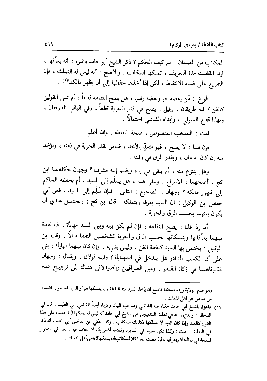 المكاتب من الضمان. ثم كيف الحكم ؟ ذكر الشيخ أبو حامد وغيره: أنه يعرفها، فذا انقضت مدة التعريف، تملكها المكاتب. والاصح: أنه ليس له التملك، فإن التفريع على فساد الالتقاط، لكن إذا (أخذها) حفظها إلى أن يظهر مالكها. فرع من بعضه حر وبعضه رقيق، هل يصح التقاطه قطعا، أم على القولين كالقن ؟ فيه طريقان. وقيل: يصح في قدر الحرية قطعا، وفي الباقي الطريقان، وبهذا قطع المتولي، وأبداه الشاشي احتمالا. قلت: المذهب المنصوص، صحة التقاطه. والله أعلم فإن قلنا: لا يصح، فهو متعد بالاخذ، ضامن بقدر الحرية في ذمته، ويؤخذ منه إن كان له مال، وبقدر الرق في رقبته. وهل ينتزع منه، أم يبقى في يده ويضم إليه مشرف ؟ وجهان حكاهما ابن كج. أصحهما: الانتزاع. وعلى هذا، هل يسلم إلى السيد، أم يحفظه الحاكم إلى ظهور مالكه ؟ وجهان. الصحيح: الثاني. فإن سلم إلى السيد، فعن أبي حفص بن الوكيل: أن السيد يعرفه ويتملكه. قال ابن كج: ويحتمل عندي أن يكون بينهما بحسب الرق والحرية. أما إذا قلنا: يصح التقاطه، فإن لم يكن بينه وبين السيد مهايأة، فاللقطة بينهما يعرفانها ويتملكانها بحسب الرق والحرية كشخصين التقطا مالا. وقال ابن الوكيل: يختص بها السيد كلقطة القن، وليس بشئ. وإن كان بينهم مهايأة، بني على أن الكسب النادر هل يدخل في المهايأة ؟ فيه قولان. ويقال: وجهان ذكرناهما في زكاة الفطر. وميل العراقيين والصيدلاني هناك إلى ترجيح عدم