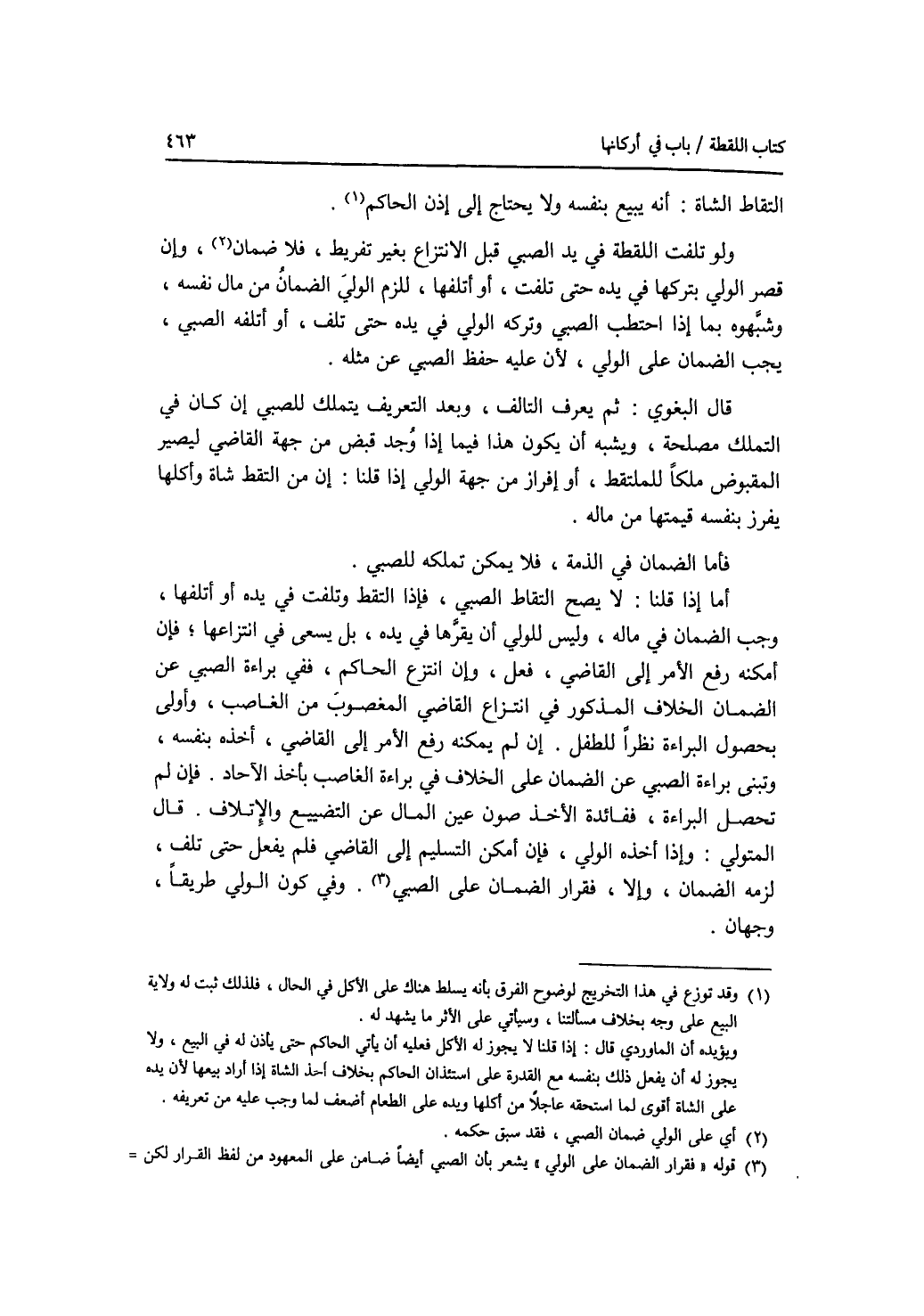 التقاط الشاة: أنه يبيع بنفسه ولا يحتاج إلى إذن الحاكم. ولو تلفت اللقطة في يد الصبي قبل الانتزاع بغير تفريط، فلا ضمان. وإن قصر الول ي بتركها في يده حتى تلفت، أو أتلفها، لزم الولي الضمان من مال نفسه، وشبهوه بما إذا احتطب الصبي وتركه الولي في يده حتى تلف، أو أتلفه الصبي، يجب الضمان على الولي، لان عليه حفظ الصبي عن مثله. قال البغوي: ثم يعرف التالف، وبعد التعريف يتملك للصبي إن كان في التملك مصلحة، ويشبه أن يكون هذا فيما إذا وجد قبض من جهة القاضي ليصير المقبوض ملكا للملتقط، أو إفراز من جهة الولي إذا قلنا: إن من التقط شاة وأكلها يفرز بنفسه قيمتها من ماله. فأما الضمان في الذمة، فلا يمكن تملكه للصبي. أما إذا قلنا: لا يصح التقاط الصبي، فإذا التقط وتلفت في يده أو أتلفها، وجب الضمان في ماله، وليس للولي أن يقرها في يده، بل يسعى في انتزاعها، فإن أمكنه رفع الامر إلى القاضي، فعل، وإن انتزع الحاكم، ففي براءة الصبي عن الضمان الخلاف المذكور في انتزاع القاضي المغصوب من الغاصب، وأولى بحصول البراءة نظرا للطفل. إن لم يمكنه رفع الامر إلى القاضي، أخذه بنفسه، وتبنى براءة الصبي عن الضمان على الخلاف في براءة الغاصب بأخذ الآحاد. فإن لم تحصل البراءة، ففائدة الاخذ صون عين المال عن التضييع والاتلاف. قال المتولي: وإذا أخذه الولي، فان أمكنه التسليم إلى القاضي فلم يفعل حتى تلف، لزمه الضمان، وإلا، فقرار الضمان على الصبي. وفي كون الولي طريقا، وجهان.