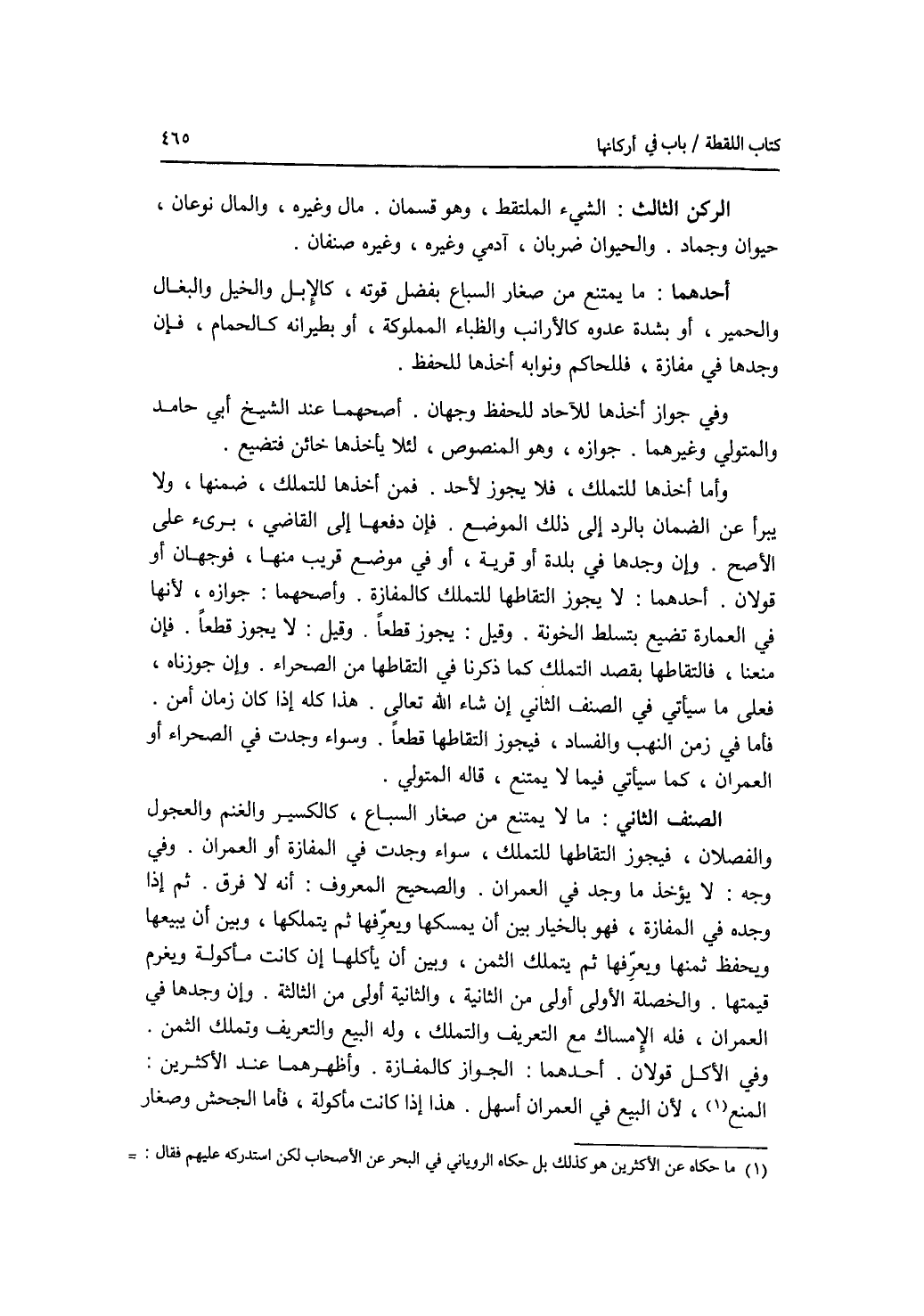 الركن الثالث: الشئ الملتقط، وهو قسمان. مال وغيره، والمال نوعان، حيوان وجماد. والحيوان ضربان، آدمي وغيره. وغيره صنفان. أحدهما: ما يمتنع من صغار السباع بفضل قوته، كالابل والخيل والبغال والحمير، أو بشدة عدوه كالارانب والظباء المملوكة، أو بطيرانه كالحمام، فإن وجدها في مفازة، فللحاكم ونوابه أخذها للحفظ. وفي جواز أخذها للآحاد للحفظ وجهان. أصحهما عند الشيخ أبي حامد والمتولي وغيرهما: جوازه، وهو المنصوص، لئلا يأخذها خائن فتضيع. وأما أخذها للتملك، فلا يجوز لاحد. فمن أخذها للتملك ضمنها، ولا يبرأ عن الضمان بالرد إلى ذلك الموضع. فإن دفعها إلى القاضي، برئ على الاصح. وإن وجدها في بلدة أو قرية، أو في موضع قريب منها، فوجهان أو قولان. أحدهما: لا يجوز التقاطها للتملك كالمفازة. وأصحهما: جوازه، لانها في العمارة تضيع بتسلط الخونة. وقيل: يجوز قطعا. وقيل: لا يجوز قطعا. فإن منعنا، فالتقاطها بقصد التملك كما ذكرنا في التقاطها من الصحراء. وإن جوزناه، فعلى ما سيأتي في النصف الثاني إن شاء الله تعالى. هذا كله إذا كان زمان أمن. فأما في زمن النهب والفساد، فيجوز التقاطها قطعا. وسواء وجدت في الصحراء أو العمران، كما سيأتي فيما لا يمتنع، قاله المتولي. الصنف الثاني: ما لا يمتنع من صغار السباع، كالكسير والغنم والعجول والفصلان، فيجوز التقاطها للتملك، سواء وجدت في المفازة أو العمران. وفي وجه: لا يؤخذ ما وجد في العمران. والصحيح المعروف: أنه لا فرق. ثم إذا وجده في المفازة، فهو بالخيار بين أن يمسكها ويعرفها ثم يتملكها، وبين أن يبيعها ويحفظ ثمنها ويعرفها ثم يتملك الثمن، وبين أن يأكلها إن كانت مأكولة ويغرم قيمتها. والخشلة الاولى أولى من الثانية، والثانية أولى من الثالثة. وإن وجدها في العمران، فله الامساك مع التعريف والتملك، وله البيع والتعريف وتملك الثمن. وفي الاكل قولان. أحدهما: الجواز كالمفازة. وأظهرهما عند الاكثرين: المنع، لان البيع في العمران أسهل هذا إذا كانت مأكولة، فأما الجحش وصغار