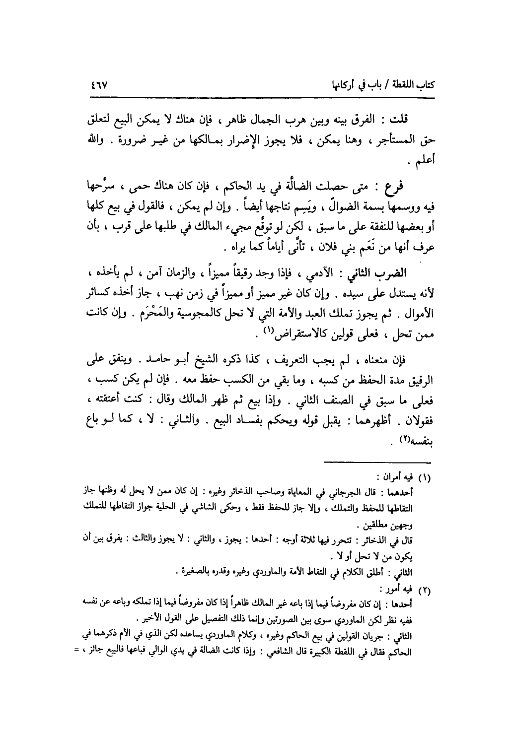 قلت: الفرق بينه وبين هرب الجمال ظاهر، فان هناك لا يمكن البيع لتعلق حق المستأجر، وهن يمكن فلا يجو الاضرار بمالكها من غير ضرورة. والله أعلم. فرع متى حصلت الضالة في يد الحاكم، فإن كان هناك حمى، سرحها فيه ووسمها بسمة الضوال، ويسم نتاجها أيضا. وإن لم يمكن، فالقول في بيع كلها أو بعضها للنفقة على ما سبق، لكن لو توقع مجئ المالك في طلبها على قرب، بأن عرف أنها من نعم بني فلان، تأنى أياما كما يراه. الضرب الثاني: الآدمي، فإذا وجد رقيقا مميزا، والزمان آمن، لم يأخذه، ونه يستدل على سيده. وإن كان غير مميز أو مميزا في زمن نهب، جاز أخذه كسائر الاموال. ثم يجوز تملك العبد والامة التي لا تحل كالمجوسية والمحرم. وإن كانت ممن تحل، فعلى قولين كالاستقراض. فإن منعناه، لم يجب التعريف، كذا ذكره الشيخ أبو حامد. ويتفق على الرقيق مدة الحفظ من كسبه، وما بقي من الكسب حفظ معه. فإن لم يكن كسب، فعلى ما سبق في الصنف الثاني. وإذا بيع ثم ظهر المالك وقال: كنت أعتقته، فقولان. أظهرهما: يقبل قوله ويحكم بفساد البيع. والثاني: لا، كما لو باع بنفسه.