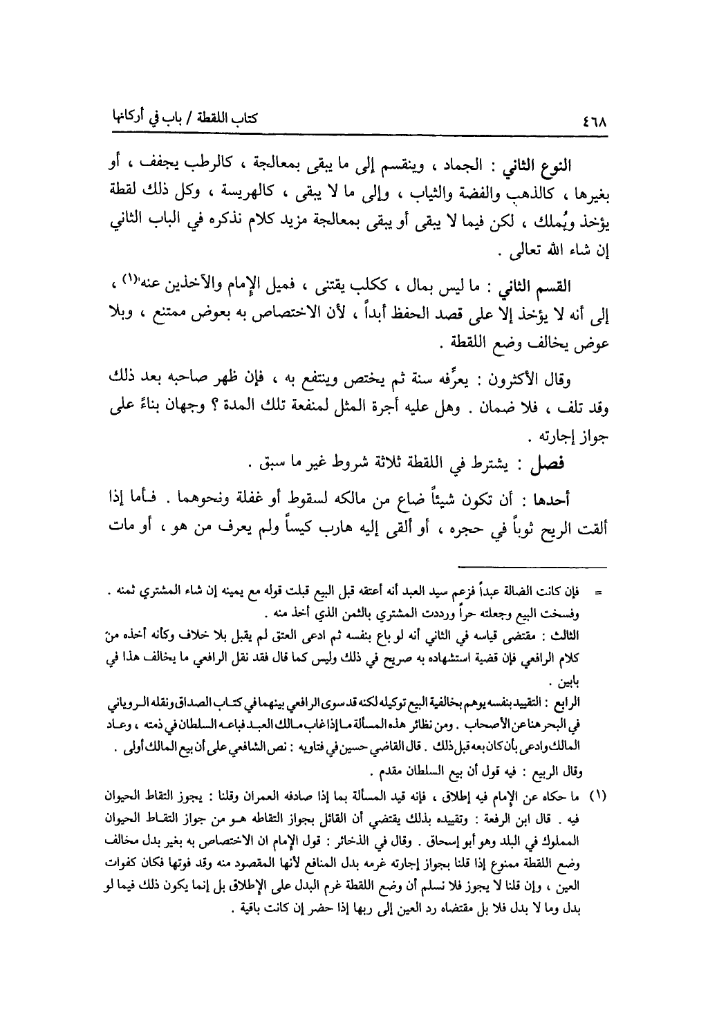 النوع الثاني: الجماد، وينقسم إلى ما لا يبقى، بمعالجة، كالرطب يخفف، أو بغيرها، كالذهب والفضة والثياب، وإلى ما لا يبقى، كالهريسة، وكل ذلك لقطة يؤخذ ويملك، لكن فيما لا يبقى بمعالجة مزيد كلام نذكره في الباب الثاني إن شاء الله تعالى. القسم الثاني: ما ليس بمال، ككلب يقتنى، فميل الامام والآخذين عنه، إلى أنه لا يؤخذ إلا على قصد الحفظ أبدا لان الاختصاص به ممتنع، وبلا عوض يخالف وضع اللقطة. وقال الاكثرون: يعرفه سنة ثم يختص وينتفع به فإن ظهر صاحبه بعد ذلك وقد تلف، فلا ضمان. وهل عليه أجرة المثل لمنفعة تلك المدة ؟ وجهان بناء على جواز إجارته. فصل يشترط في اللقطة ثلاثة شروط غير ما سبق. أحدها: أن تكون شيئا ضاع من مالكه لسقوط أو غفلة ونحوهما. فأما إذا ألقت الريح ثوبا في حجره أو ألقى إليه هارب كيسا ولم يعرف من هو