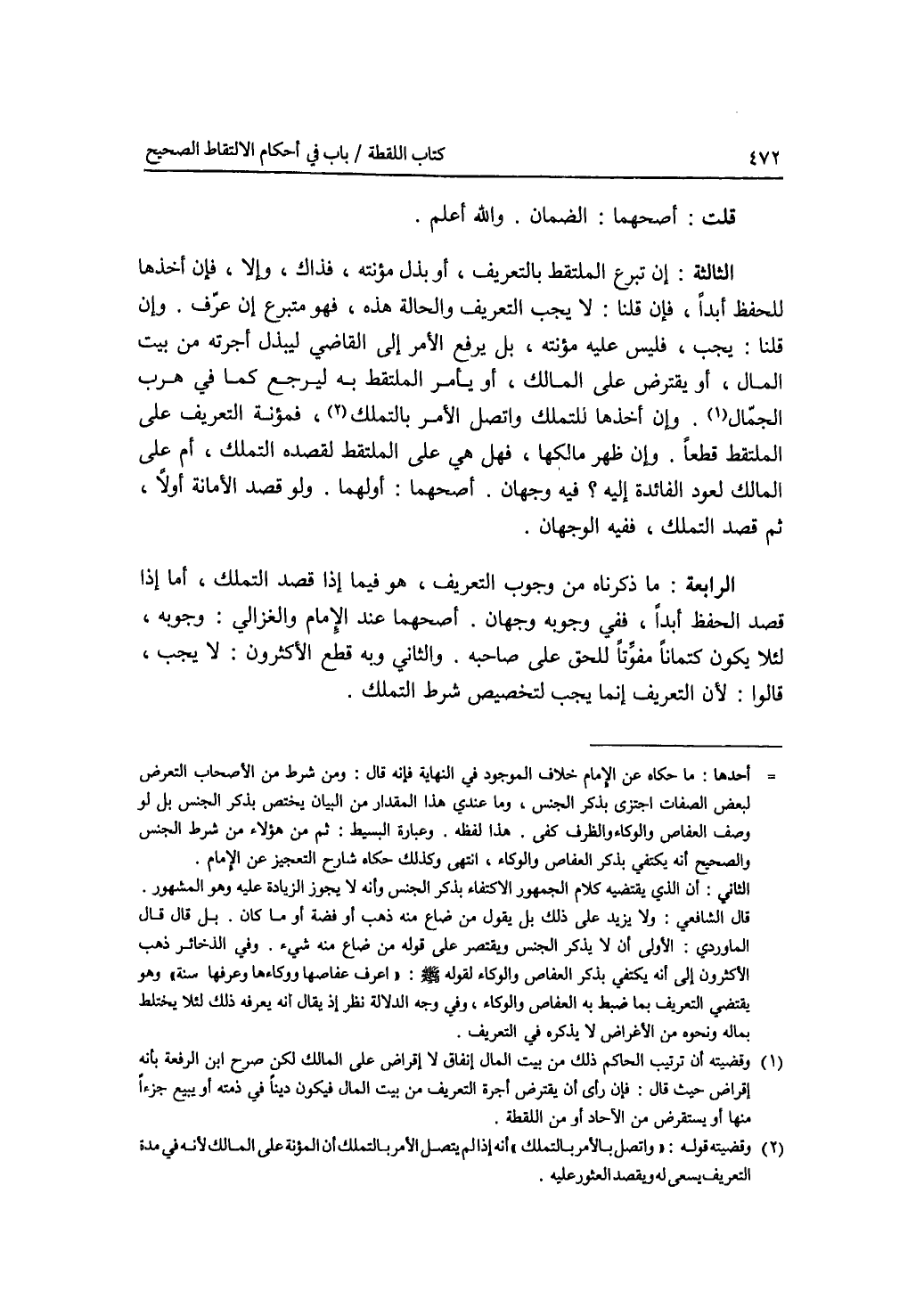 قلت: أصحهما: الضمان. والله أعلم الثالثة: إن تبرع الملتقط بالتعريف، أو بذل مؤنته، فذاك، وإلا، فإن أخذها للحفظ أبدا، فإن قلنا: لا يجب التعريف والحالة هذه، فهو متبرع إن عرف. وإن قلنا: يجب، فليس عليه مؤنته، بل يرفع الامر إلى القاضي ليبذل أجرته من بيت المال، أو يقترض على المالك، أو يأمر الملتقط به ليرجع كما في هرب الجمال. وإن أخذها للتملك واتصل الامر بالتملك، فمؤنة التعريف على الملتقط قطعا. وإن ظهر مالكها، فهل هي على الملتقط لقصده التملك، أم على المالك لعود الفائدة إليه ؟ فيه وجهان. أصحهما: أولهما. ولو قصد الامانة أولا، ثم قصد التملك، ففيه الوجهان. الرابعة: ما ذكرناه من وجوب التعريف، هو فيما إذا قصد التملك، أما إذا قصد الحفظ أبدا، ففي وجوبه وجهان. أصحهما عند الامام والغزالي: وجوبه، لئلا يكون كتمانا مفوتا للحق على صاحبه. والثاني وبه قطع الاكثرون: لا يجب، قالوا: لان التعريف إنما يجب لتخصيص شرط التملك.
