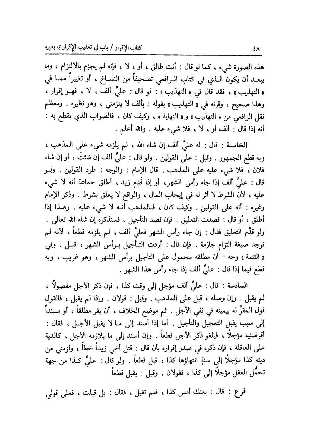 هذه الصورة شئ، كما لو قال: أنت طالق، أو، لا، فإنه لم يجزم بالالتزام، وما يبعد أن يكون الذي في كتاب الرافعي تصحيفا من النساخ، أو تغييرا مما في التهذيب، فقد قال في التهذيب: لو قال: علي ألف، لا، فهو إقرار، وهذا صحيح، وقرنه في التهذيب بقوله: بألف لا يلزمني، وهو نظيره. ومعظم نقل الرافعي من التهذيب والنهاية، وكيف كان، فالصواب الذي يقطع به: أنه إذا قال: ألف أو، لا، فشئ عليه. والله أعلم. الخامسة: قال: له علي (ألف) إن شاء الله، لم يلزمه شئ على المذهب، وبه قطع الجمهور. وقيل: على القولين. ولو قال: علي ألف إن شئت، أو إن شاء فلان، فلا شئ عليه على المذهب. قال الامام: والوجه: طرد القولين. ولو قال: علي ألف إذا جاء رأس الشهر، أو إذا قدم زيد، أطلق جماعة أنه لا شئ عليه، لان الشرط لا أثر له في إيجاب المال، والواقع لا يعلق بشرط. وذكر الامام وغيره: أنه على القولين. وكيف كان، فالمذهب أنه لا شئ عليه وهذا إذا أطلق، أو قال: قصدت التعليق. فإن قصد التأجيل، فسنذكره إن شاء الله تعالى. ولو قدم التعليق فقال: إن جاء رأس الشهر فعلي ألف، لم يلزمه قطعا، لانه لم توجد صيغة التزام جازمة. فإن قال: أردت التأجيل برأس الشهر، قبل. وفي التتمة وجه: أن مطلقه محمول على التأجيل برأس الشهر، وهو غريب، وبه قطع فيما إذا قال: علي ألف إذا جاء رأس الشهر. السادسة: قال: علي ألف مؤجل إلى وقت كذا، فإن ذكر الاجل مفصولا، لم يقبل. وإن وصله، قبل على المذهب. وقيل: قولان. وإذا لم يقبل، فالقول قول المقر له بيمينه في نفي الاجل. ثم موضع الخلاف، أن يقر مطلقا، أو مسندا إلى سبب يقبل التعجيل والتأجيل. أما إذا أسند إلى ما لا يقبل الاجل، فقال: أقرضنيه مؤجلا، فيلغو ذكر الاجل قطعا. وإن أسند إلى ما يلازمه الاجل، كالدية على العاقلة، فإن ذكره في صدر إقراره بأن قا: قتل أخي زيدا خطأ، ولزمني من ديته كذا مؤجلا إلى سنة انتهاؤها كذا، قبل قطعا. ولو قال: علي كذا من جهة تحمل العقل مؤجلا إلى كذا، فقولان. وقيل: يقبل قطعا. فرع قال: بعتك أمس كذا، فلم تقبل، فقال: بل قبلت، فعلى قولي