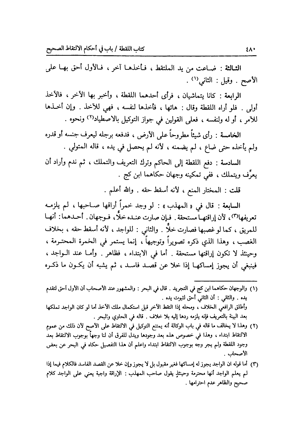 الثالثة: ضاعت من يد الملتقط، فأخذها آخر، فالاول أحق بها على الاصح. وقيل: الثاني. الرابع: كانا يتماشيان، فرأى أحدهما اللقطة، وأخبر بها الآخر، فالآخذ أولى. فلو أراه اللقطة وقال: هاتها، فأجذها لنفسه، فهي للآخذ. وإن أخذها للآمر، أو له ولنفسه، فعلى القولين في جواز التوكيل بالاصطياد ونحوه. الخامسة: رأى شيئا مطروحا على الارض، فدفعه برجله ليعرف جنسه أو قدره ولم يأخذه حتى ضاع، لم يضمنه، لانه لم يحصل في يده، قاله المتولي. السادسة: دفع اللقطة إلى الحاكم وترك التعريف والتملك، ثم ندم وأراد أن يعرف ويتملك، ففي تمكينه وجهان حكاهما ابن كج. قلت: المختار المنع، لانه أسقط حقه. والله أعلم السابعة: قال في المهذب: لو وجد خمرا أراقها صاحبها، لم يلزمه تعريفها، لان إراقتها مستحقة. فإن صارت عنده خلا، فوجهان. أحدهما: أنها للمريق، كما لو غصبها فصارت خلا. والثاني: للواجد، لانه أسقط حقه، بخلاف الغصب، وهذا الذي ذكره تصويرا وتوجيها، إنما يستمر في الخمرة المحترمة، وحينئذ لا تكون إراقتها مستحقة. أما في الابتداء، فظاهر. وأما عند الواجد، فينبغي أن يجوز إمساكها إذا خلا عن قصد فاسد، ثم يشبه أن يكون ما ذكره