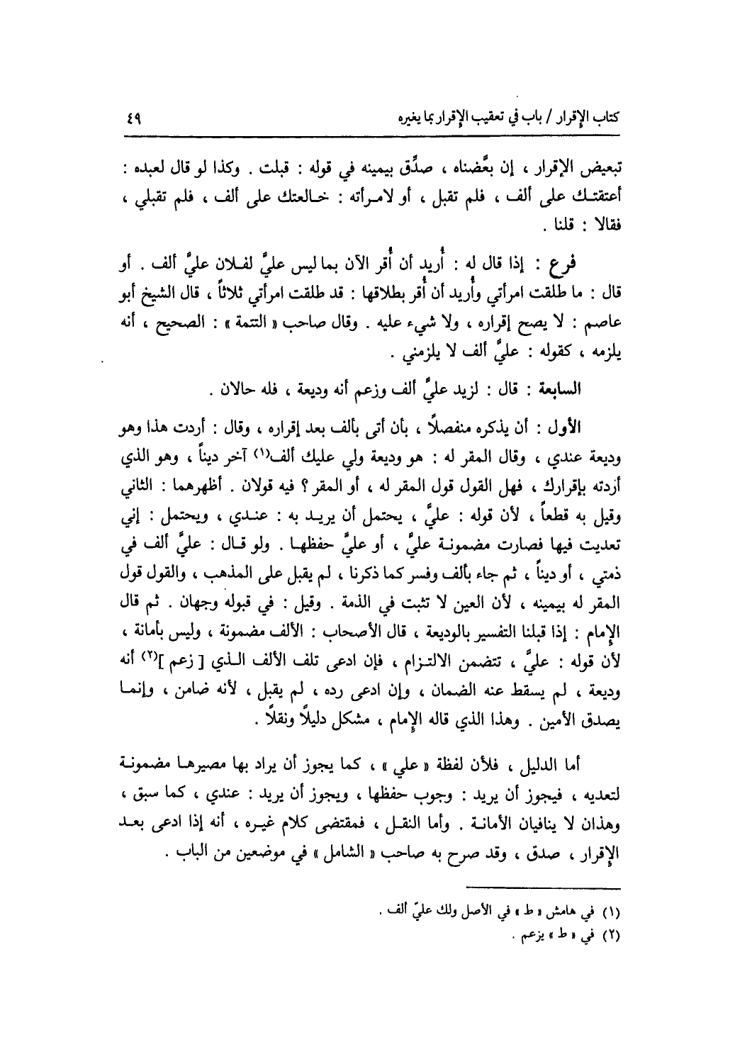 تبعيض الا قرار، إن بعضناه، صدق بيمينه في قوله: قبلت. وكذا لو قال لعبده: أعتقتك على ألف، فلم تقبل، أو لامرأته: خالعتك على ألف، فلم تقبلي، فقالا: قبلنا. فرع إذا قال له: أريد أن أقر الآن بما ليس علي لفلان علي ألف. أو قال: ما طلقت امرأتي وأريد أن أقر بطلاقها: قد طلقت امرأتي ثلاثا، قال الشيخ أبو عاصم: لا يصح إقراره، ولا شئ عليه. وقال صاحب التتمة: الصحيح، أنه يلزمه، كقوله: علي ألف لا يلزمني. السابعة: قال: لزيد علي ألف وزعم أنه وديعة، فله حالان. الاول: أن يذكره منفصلا، بأن أتى بألف بعد إقراره، وقال: أردت هذا وهو وديعة عندي، وقال المقر له، هو وديعة ولي عليك ألف آخر دينا، وهو الذي أردته بإقرارك، فهل القول قول المقر له، أو المقر ؟ فيه قولان. أظهرهما: الثاني وقيل به قطعا، لان قوله: علي، يحتمل أن يريد به: عندي، ويحتمل: إني تعديت فيها فصارت مضمونة علي، أو علي حفظها. ولو قال: علي ألف في ذمتي، أو دينا، ثم جاء بألف وفسر كما ذكرنا، لم يقبل على المذهب، والقول قول المقر له بيمينه، لان العين لا تثبت في الذمة. وقيل: في قبوله وجهان. ثم قال الامام: إذا قبلنا التفسير بالوديعة، قال الاصحاب: الالف مضمونة، وليس بأمانة، لان قوله: علي، تتضمن الالتزام. فإن ادعى تلف الالف الذي يزعم أنه وديعة، لم يسقط عنه الضمان، وإن ادعى رده، لم يقبل، لانه ضامن، وإنما يصدق الامين. وهذا الذي قاله الامام، مشكل دليلا ونقلا. أما الدليل، فلان لفظه علي، كما يجوز أن يراد بها مصيرها مضمونة لتعديه، فيجوز أن يريد: وجوب حفظها، ويجوز أن يريد عندي، كما سبق، وهذان لا ينافيان الامانة. وأما النقل، فمقتضى كلام غيره، أنه إذا ادعى تلفه بعد الاقرار، صدق، وقد صرح به صاحب الشامل في موضعين من الباب.
