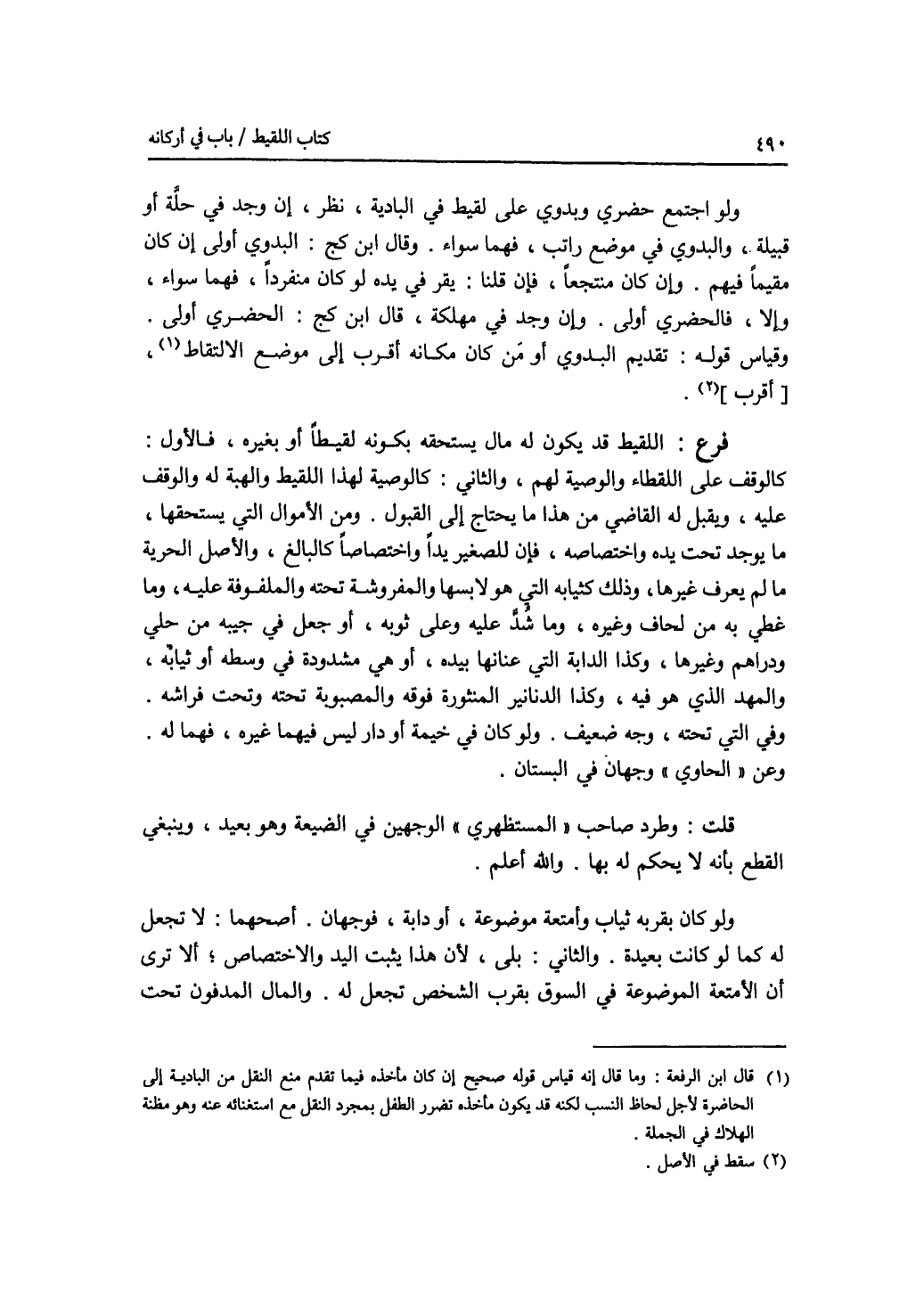 ولو اجتمع حضري وبدوي على لقيط في البادية، نظر، إن وجد في حلة أو قبيلة، والبدوي في موضع راتب، فهما سواء. وقال ابن كج: البدوي أولى إن كان مقيما فيهم. وإن كان منتجعا، فإن قلنا: يقر في يده لو كان منفردا، فهما سواء، وإلا، فالحضري أولى. وإن وجد في مهلكة، قال ابن كج: الحضري أولى. وقياس قوله: تقديم البدوي أو من كان مكانه أقرب إلى موضع الالتقاط، أقرب. فرع اللقيط قد يكون له مال يستحقه بكونه لقيطا أو بغيره، فالاول: كالوقف على اللقطاء والوصية لهم، والثاني: كالوصية لهذا اللقيط والهبة له والوقف عليه، ويقبل له القاضي من هذا ما يحتاج إلى القبول. ومن الاموال التي يستحقها، ما يوجد تحت يده واختصاصه، فإن للصغير يدا واختصاصا كالبالغ، والاصل الحرية ما لم يعرف غيرها، وذلك كثيابه التي هو لابسها والمفروشة تحته والملفوفة عليه، وما غطي به من لحاف وغيره، وما شد عليه وعلى ثوبه، أو جعل في جيبه من حلي ودراهم وغيرها، وكذا الدابة التي عنانها بيده، أو هي مشدودة في وسطه أو ثيابه، والمهد الذي هو فيه، وكذا الدنانير المنثورة فوقه والمصبوبة تحته وتحت فراشه. وفي التي تحته، وجه ضعيف. ولو كان في خيمة أو دار ليس فيهما غيره، فهما له. وعن الحاوي وجهان في البستان. قلت: وطرد صاحب المستظهري الوجهين في الضيعة وهو بعيد، وينبغي القطع بأنه لا يحكم له بها. والله أعلم ولو كان بقربه ثياب وأمتعة موضوعة، أو دابة، فوجهان. أصحهما: لا تجعل له كما لو كانت بعيدة. والثاني: بلى، لان هذا يثبت اليد والاختصاص، ألا ترى أن الامتعة الموضوعة في السوق بقرب الشخص تجعل له. والمال المدفون تحت