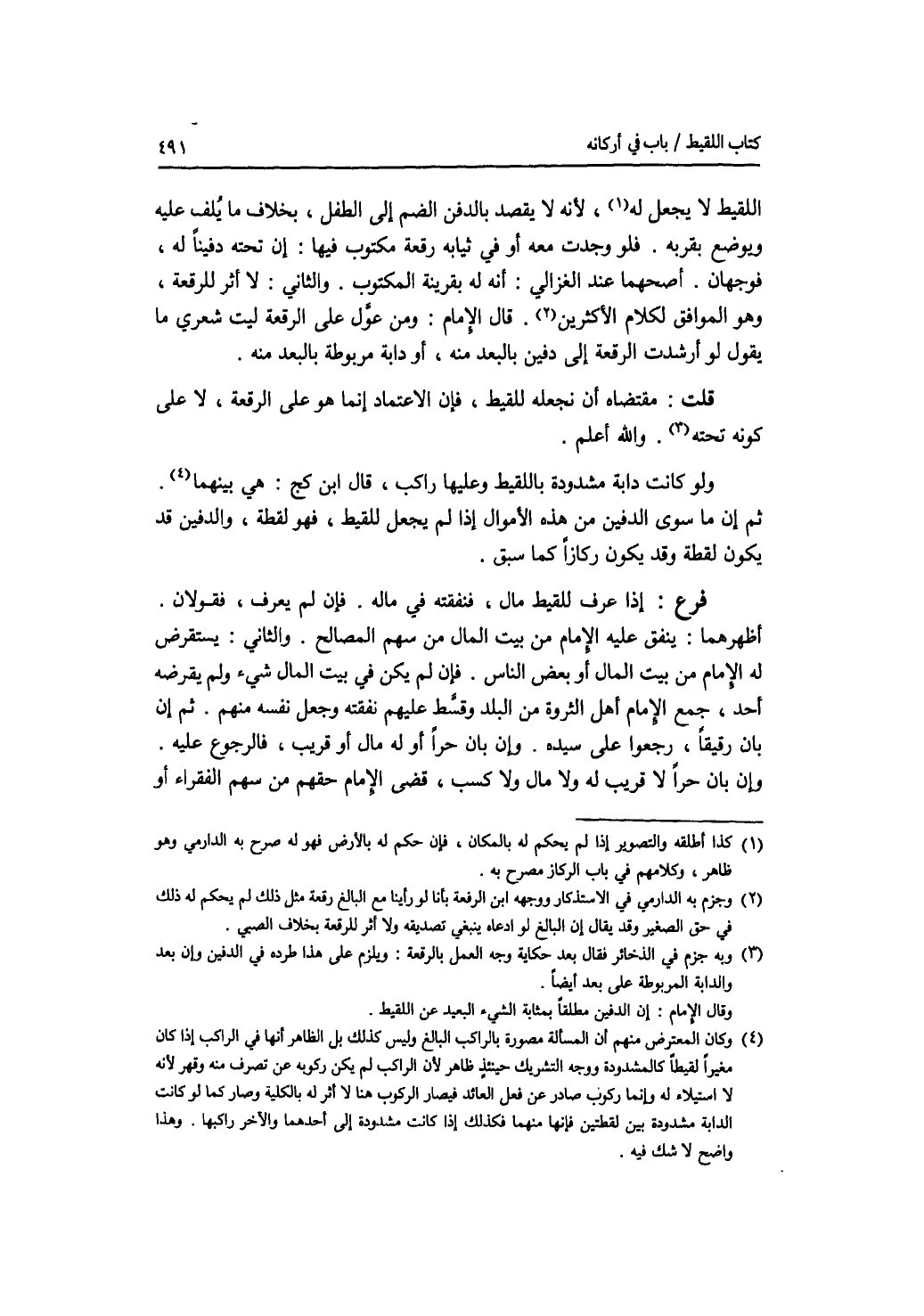 اللقيط لا يجعل له، لانه لا يقصد بالدفن الضم إلى الطفل، بخلاف ما يلف عليه ويوضع بقربه. فلو وجدت معه أو في ثيابه رقعة مكتوب فيها: إن تحته دفينا له، فوجهان. أصحهما عند الغزالي: أنه له بقرينة المكتوب. والثاني: لا أثر للرقعة، وهو الموافق لكلام الاكثرين. قال الامام: ومن عول على الرقعة ليت شعري ما يقول لو أرشدت الرقعة إلى دفين بالعبد منه، أو دابة مربوطة بالبعد منه. قلت: مقتضاه أن نجعله للقيط، فإن الاعتماد إنما هو على الرقعة، لا على كونه تحته. والله أعلم ولو كانت دابة مشدودة باللقيط وعليها راكب، قال ابن كج: هي بينهما. ثم إن ما سوى الدفين من هذه الاموال إذا لم يجعل للقيط، فهو لقطة، والدفين قد يكون لقطة وقد يكون ركازا كما سبق. فرع إذا عرف للقيط مال، فنفقته في ماله. فان لم يعرف، فقولان. أظهرهما: ينفق عليه الامام من بيت المال من سهم المصالح. والثاني: يستقرض له الامام من بيت المال أو بعض الناس. فإن لم يكن في بيت المال شئ ولم يقرض أحد، جمع الامام أهل الثروة من البلد وقسط عليهم نفقته وجعل نفسه منهم. ثم إن بان رقيقا، رجعوا على سيده. وإن بان حرا أو له مال أو قريب، فالرجوع عليه. وإن بان حرا لا قريب له ولا مال ولا كسب، قضى الامام حقهم من سهم الفقراء أو