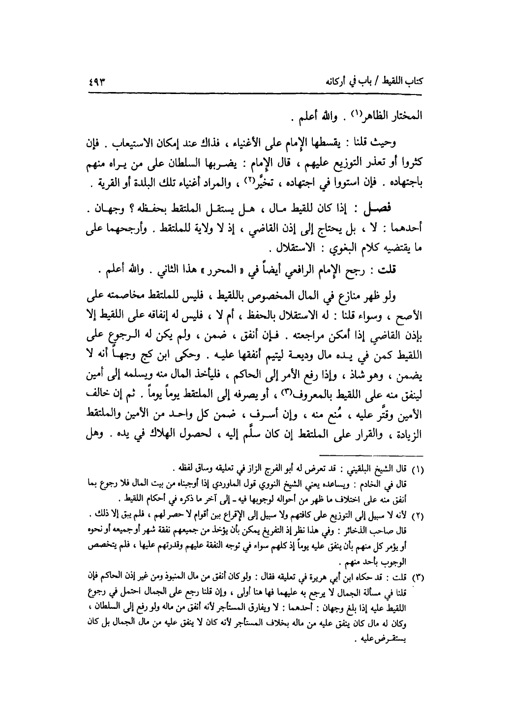المختار الظاهر والله أعلم وحيث قلنا: يقسطها الامام على الاغنياء، فذاك عند إمكان الاستيعاب. فإن كثروا أو تعذر التوزيع عليهم، قال الامام: يضربها السلطان على من يراه منهم باجتهاده. فإن استووا في اجتهاد، تخير، والمراد أغنياء تلك البلدة أو القرية. فصل إذا كان للقيط مال، هل يستقل الملتقط بحفظه ؟ وجهان. أحدهما: لا، بل يحتاج إلى إذن القاضي، إذ لا ولاية للملتقط. وأرجحهما على ما يقتضيه كلام البغوي: الاستقلال. قلت: رجح الامام الرافعي أيضا في المحرر هذا الثاني. والله أعلم ولو ظهر منازع في المال المخصوص باللقيط، فليس للملتقط مخاصمته على الاصح، وسواء قلنا: له الاستقلال بالحفظ، أم لا، فليس له إنفاقه على اللقيط إلا بإذن القاضي إذا أمكن مراجعته. فإن أنفق، ضمن، ولم يكن له الرجوع على اللقيط كمن في يده مال وديعة ليتيم أنفقها عليه. وحكى ابن كج وجها أنه لا يضمن، (وهو شاذ)، وإذا رفع الامر إلى الحاكم، فليأخذ المال منه ويسلمه إلى أمين لينفق منه على اللقيط بالمعروف، أو يصرفه إلى الملتقط يوما يوما. ثم إن خالف الامين وقتر عليه، منع منه، وإن أسرف، ضمن كل واحد من الامين والملتقط الزيادة، والقرار على الملتقط إن كان سلم إليه، لحصول الهلاك في يده. وهل