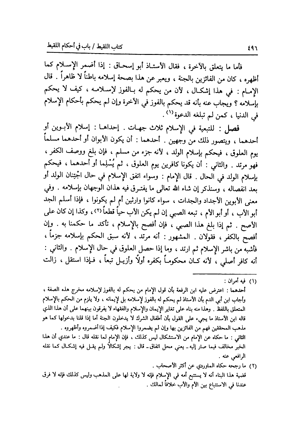 فأما ما يتعلق بالآخرة، فقال الاستاذ أبو إسحاق: إذا أضمر الاسلام كما أظهره، كان من الفائزين بالجنة، ويعبر عن هذا بصحة إسلامه باطنا لا ظاهرا. قال الامام: في هذا إشكال، لان من يحكم له بالفوز لاسلامه، كيف لا يحكم باسلامه ؟ ويجاب عنه بأنه قد يحكم بالفوز في الآخرة وإن لم يحكم بأحكام الاسلام في الدنيا، كمن لم تبلغه الدعوة.