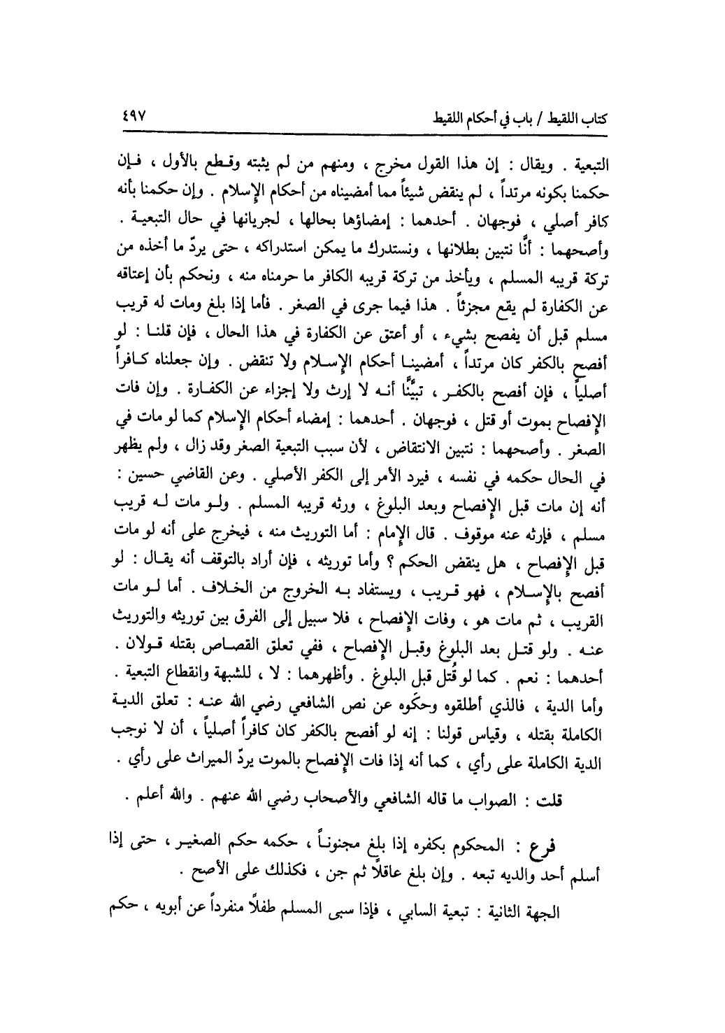 التبعية. ويقال: إن هذا القول مخرج، ومنهم من لم يثبته وقطع بالاول. فإن حكمنا بكونه مرتدا لم قص شيئا مما أقضيناه من أحكام الاسلام. وإن حكمنا بأنه كافر أصلي، فوجهان. أحدهما: إمضاؤها بحالها، لجريانه في حال التبعية. وأصحهما: أنا نتبين بطلانها، ونستدرك ما يمكن استدراكه، حتى يرد ما أخذه من تركه قريبة المسلم، ويأخذ من تركه قريبه الكافر ما حرمناه منه، ونحكم بأن إعتاقه عن الكفارة لم يقع مجزئا. هذا فيما جرى في الصغر. فأما إذا بلغ ومات له قريب مسلم قبل أن يفصح بشئ، أو أعتق عن الكفارة في هذا الحال، فإن قلنا: لو أفصح بالكفر كان مرتدا، أمضينا أحكام الاسلام ولا تنقض. وإن جعلناه كافرا أصليا، فإن أفصح بالكفر، تبينا أنه لا إرث ولا إجزاء عن الكفارة. وإن فات الافصاح بموت أو قتل، فوجهان. أحدهما: إمضاء أحكام الاسلام كما لو مات في الصغر. وأصحهما: نتبين الانتقاض، لان سبب التعبية الصغر وقد زال، ولم يظهر في الحال حكمه في نفسه، فيرد الامر إلى الكفر الاصلي. وعن القاضي حسين: أنه إن مات قبل الافصاح وبعد البلوغ، ورثه قريبه المسلم. ولو مات له قريب مسلم، فارثه عنه موقوف. قال الامام: أما التوريث منه، فيخرج على أنه لو مات قبل الافصاح، هل ينقض الحكم ؟ وأما توريثه، فإن أراد بالتوقف أنه يقال: لو أفصح بالاسلام، فهو قريب، ويستفاد به الخروج من الخلاف. وأما لو مات القريب، ثم مات هو، وفات الافصاح، فلا سبيل إلى الفرق بين توريثة والتوريث عنه. ولو قتل بعد البلوغ وقبل الافصاح، ففى تعلق القصاص بقتله قولان أحدهما: نعم كما لو قتل قبل البلوغ وأظهرهما: لا، للشبهة وانقطاع التبعية. وأما الدية، فالذي أطلقوه وحكوه عن نص الشافعي رضي الله عنه: تعلق الدية الكاملة بقتله، وقياس قولنا: إنه لو أفصح بالكفر كان كافرا أصليا، أن لا نوجب الدية الكاملة على رأي، كما أنه إذا فات الافصاح بالموت يرد الميراث على رأي. قلت: الصواب ما قاله الشافعي والاصحاب رضي الله عنهم. والله أعلم فرع المحكوم بكفره إذا بلغ مجنونا، حكمه حكم الصغير، حتى إذا أسلم أحد والديه تبعه. وإن بلغ عاقلا ثم جن، فكذلك على الاصح. الجهة الثانية: تبعية السابي، فإذا سبى المسلم طفلا منفردا عن أبويه، حكم
