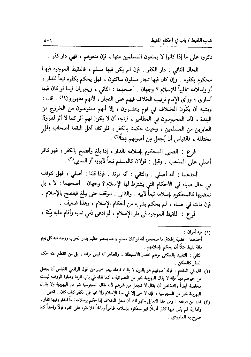 ذكروه على ما إذا كانوا لا يمنعون المسلمين منها، فإن منعوهن، فهي دار كفر. الحال الثاني: دار الكفر. فإن لم يكن فيها مسلم، فاللقيط الموجود فيها محكوم بكفره. وإن كان فيها تجار مسلمون ساكنون، فهل يحكم بكفره تبعا للدار، أو باسلامه تغليبا للاسلام ؟ وجهان. أصحهما: الثاني، ويجريان فيما لو كان فيها أسارى، ورأى الامام ترتيب الخلاف فيهم على التجار، لانهم مقهورون. قال: ويشبه أن يكون الخلاف في قوم ينتشرون، إلا أنهم ممنوعون من الخروج من البلدة، فأما المحبوسون في المطامير، فيتجه أن لا يكون لهم أثر كما لا أثر لطروق العابرين من المسلمين، وحيث حكمنا بالكفر، فلو كان أهل البقعة أصحاب ملل مختلفة، فالقياس أن يجعل من أصونهم دينا. فرع الصبي المحكوم بإسلامه بالدار، إذا بلغ وأفصح بالكفر، فهو كافر أصلي على المذهب. وقيل: قولان كالمسلم تبعا لابويه أو السابي. أحدهما: أنه أصلي. والثاني: أنه مرتد. فإذا قلنا: أصلي، فهل نتوقف في حال صباه في الاحكام التي يشترط لها الاسلام ؟ وجهان. أصحهما: لا، بل نمضيها كالمحكوم باسلامه تبعا لابيه. والثاني: نتوقف حتى يبلغ فيفصح بالاسلام. فإن مات في صباه، لم يحكم بشئ من أحكام الاسلام، وهذا ضعيف. فرع اللقيط الموجود في دار الاسلام، لو ادعى ذمي نسبه وأقام عليه بينة،