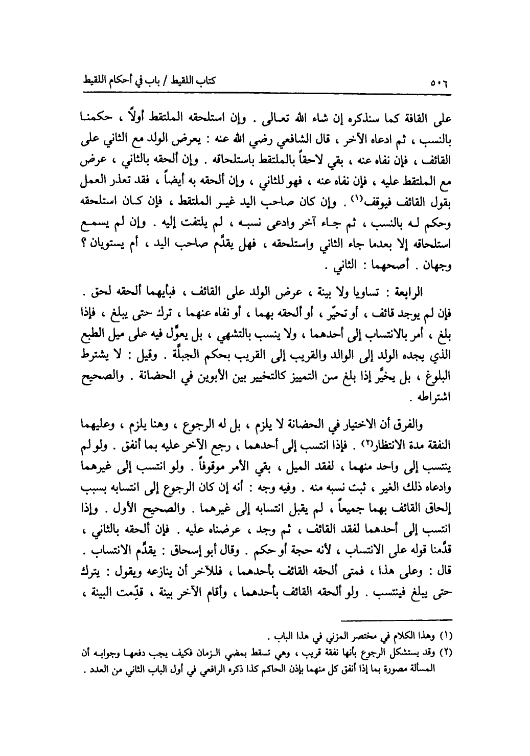 على القافة كما سنذكره إن شاء الله تعالى. وإن استلحقه الملتقط أولا، حكمنا بالنسب، ثم ادعاه الآخر، قال الشافعي رضي الله عنه: يعرض الولد مع الثاني على القائف، فإن نفاه عنه، بقي لاحقا بالملتقط باستلحاقه. وإن ألحقه بالثاني، عرض مع الملتقط عليه، فإن نفاه عنه، فهو للثاني، وإن ألحقه به أيضا، فقد تعذر العمل بقول القائف فيوقف. وإن كان صاحب اليد غير الملتقط، فإن كان استلحقه وحكم (له) بالنسب، ثم جاء آخر وادعى نسبه، لم يلتفت إليه. وإن لم يسمع استلحاقه إلا بعدما جاء الثاني واستلحقه، فهل يقدم صاحب اليد، أم يستويان ؟ وجهان. أصحهما: الثاني. الرابعة: تساويا ولا بينة، عرض الولد على القائف، فبأيهما ألحقه لحق. فإن لم يوجد قائف، أو تحير، أو ألحقه بهما، أو نفاه عنهما، ترك حتى يبلغ، فإذا بلغ، أمر بالانتساب إلى أحدهما، ولا ينسب بالنشهي، بل يعول فيه على ميل الطبع الذي يجده الولد إلى الوالد إلى القريب والقريب بحكم الجبلة. وقيل: لا يشترط البلوغ، بل يخير إذا بلغ سن التمييز كالتخيير بين الابوين في الحضانة. والصحيح اشتراطه. والفرق أن الاختيار في الحضانة لا يلزم، بل له الرجوع، وهنا يلزم، وعليهما النفقة مدة الانتظار. فإذا انتسب إلى أحدهما، رجع الآخر عليه بما أنفق. ولو لم ينتسب إلى واحد منهما، لفقد الميل، بقي الامر موقوفا. ولو انتسب إلى غيرهما وادعاه ذلك الغير، ثبت نسبه منه. وفيه وجه: أنه إن كان الرجوع إلى انتسابه بسبب إلحاق القائف بهما جميعا، لم يقبل انتسابه إلى غيرهما. والصحيح الاول. وإذا انتسب إلى أحدهما لفقد القائف، ثم وجد، عرضناه عليه. فإن ألحقه بالثاني، قدمنا قوله على الانتساب، لانه حجة أو حكم. وقال أبو إسحاق: يقدم الانتساب. قال: وعلى هذا، فمتى ألحقه القائف بأحدهما، فللآخر أن ينازعه ويقول: يترك حتى يبلغ فينتسب. ولو ألحقه القائف بأحدهما، وأقام الآخر بينة، قدمت البينة،