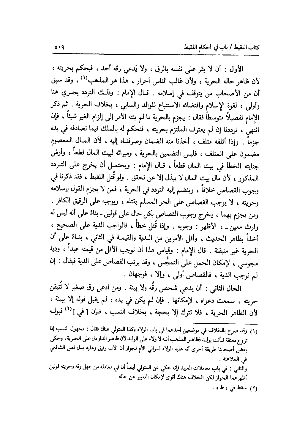 الاول: أن لا يقر على نفسه بالرق، ولا يدعي رقه أحد، فيحكم بحريته، لان ظاهر حاله الحرية، ولان غالب الناس أحرار، هذا هو المذهب، وقد سبق أن من الاصحاب من يتوقف في إسلامه. قال الامام: وذلك التردد يجري هنا وأولى، لقوة الاسلام واقتضائه الاستتباع للوالد والسابي، بخلاف الحرية. ثم ذكر الامام تفصيلا متوسطا فقال: يجزم بالحرية ما لم ينته الامر إلى إلزام الغير شيئا، فإن انتهى، ترددنا إن لم يعتر ف الملتزم بحريته، فنحكم له بالملك فيما نصادفه في يده جزما. وإذا أتلفه متلف، أخذنا منه الضمان وصرفناه إليه، لان المال المعصوم مضمون على المتلف، فليس التضمين بالحرية، وميراثه لبيت المال قطعا، وأرش جنايته الخطأ في بيت المال قطعا، قال الامام: ويحتمل أن يخرج على التردد المذكور، لان مال بيت المال لا يبذل إلا عن تحقق. ولو قتل اللقيط، فقد ذكرنا في وجوب القصاص خلافا، وينضم إليه التردد في الحرية، فمن لا يجزم القول باسلامه وحريته، لا يوجب القصاص على الحر المسلم بقتله، ويوجبه على الرقيق الكافر. ومن يجزم بهما، يخرج وجوب القصاص بكل حال على قولين - بناء على أنه ليس له وارث معين -، الاظهر: وجوبه. وإذا قتل خطأ، فالواجب الدية على الصحيح، أخذا بظاهر الحديث، وأقل الامرين من الدية والقيمة في الثاني، بناء على أن الحرية غير متيقنة. قال الامام: وقياس هذا أن نوجب الاقل من قيمته عبدا، ودية مجوسي، لامكان الحمل على التمجس، وقد يرتب القصاص على الدية فيقال: إن لم نوجب الدية، فالقصاص أولى، وإلا، فوجهان. الحال الثاني: أن يدعي شخص رقه ولا بينة. ومن ادعى رق صغير لا تتيقن حريته، سمعت دعواه، لامكانها. فإن لم يكن في يده، لم يقبل قوله إلا ببينة، لان الظاهر الحرية، فلا تترك إلا بحجة، بخلاف النسب، فإن قبوله