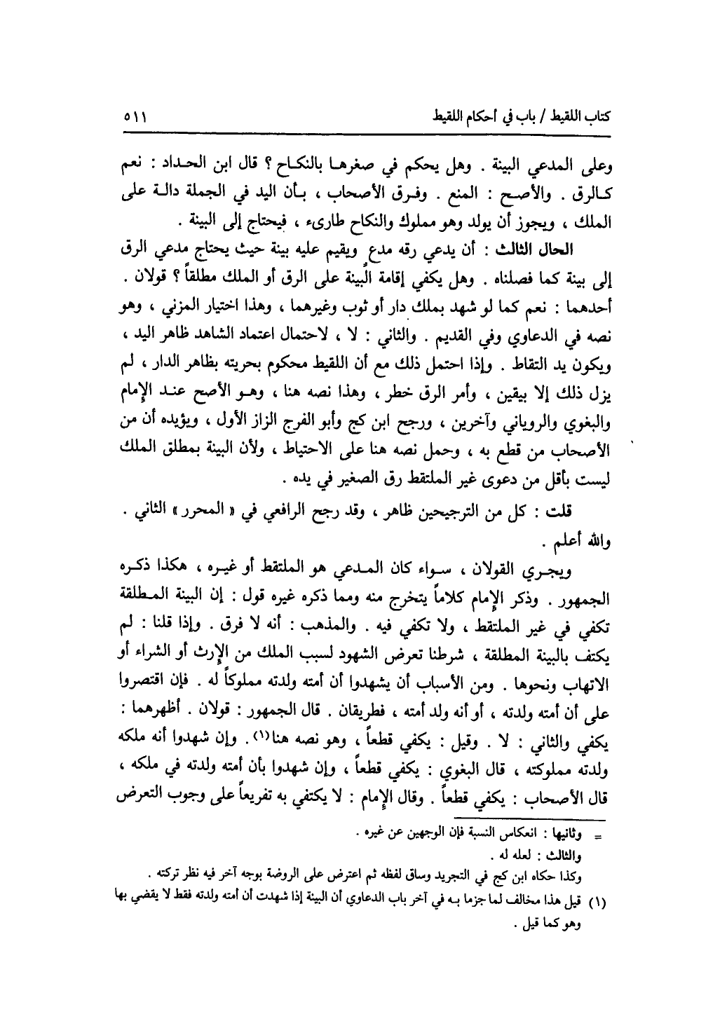 وعلى المدعي البينة. وهل يحكم في صغرها بالنكاح ؟ قال ابن الحداد: نعم كالرق. والاصح: المنع. وفرق الاصحاب، بأن اليد في الجملة دالة على الملك، ويجوز أن يولد وهو مملوك والنكاح طارئ، فيحتاج إلى البينة. الحال الثالث: أن يدعي رقه مدع ويقيم عليه بينة حيث يحتاج مدعي الرق إلى بينة كما فصلناه. وهل يكفي إقامة البينة على الرق أو الملك مطلقا ؟ قولان. أحدهما: نعم كما لو شهد بملك دار أو ثوب وغيرهما، وهذا اختيار المزني، وهو نصه في الدعاوى وفي القديم. والثاني: لا، لاحتمال اعتماد الشاهد ظاهر اليد، ويكون يد التقاط. وإذا احتمل ذلك مع أن اللقيط محكوم بحريته بظاهر الدار، لم يزل ذلك إلا بيقين، وأمر الرق خطر، وهذا نصه (هنا)، وهو الاصح عند الامام والبغوي والروياني وآخرين، ورجح ابن كج وأبو الفرج الزاز الاول، ويؤيده أن من الاصحاب من قطع به، وحمل نصه هنا على الاحتياط، ولان البينة بمطلق الملك ليست بأقل من دعوى غير الملتقط رق الصغير في يده. قلت: كل من الترجيحين ظاهر، وقد رجح الرافعي في المحرر الثاني. والله أعلم ويجري القولان، سواء كان المدعي هو الملتقط أو غيره، هكذا ذكره الجمهور. وذكر الامام كلاما يتخرج منه ومما ذكره غيره قول: أن البينة المطلقة تكفي في غير الملتقط، ولا تكفي فيه. والمذه ب: أنه لا فرق. وإذا قلنا: لم يكتف بالبينة المطلقة، شرطنا تعرض الشهود لسبب الملك من الارث أو الثراء أو الالتهاب ونحوها. ومن الاسباب أن يشهدوا أن أمته ولدته مملوكا له. فإن اقتصروا على أن أمته ولدته، أو أنه ولد أمته، فطريقان. قال الجمهور: قولان. أظهرهما: يكفي. والثاني: لا. وقيل: يكفي قطعا، وهو نصه هنا. وإن شهدوا أنه ملكه ولدته مملوكته قال البغوي: يكفي قطعا، وهو نصه هنا. وإن شهدوا أنه ملكه ولدته مملوكته، قال البغوي: يكفي قطعا، وإن شهدوا بأن أمته ولدته في ملكه، قال الاصحاب: يكفي قطعا. وقال الامام: لا يكتفى به تفريعا على وجوب التعرض
