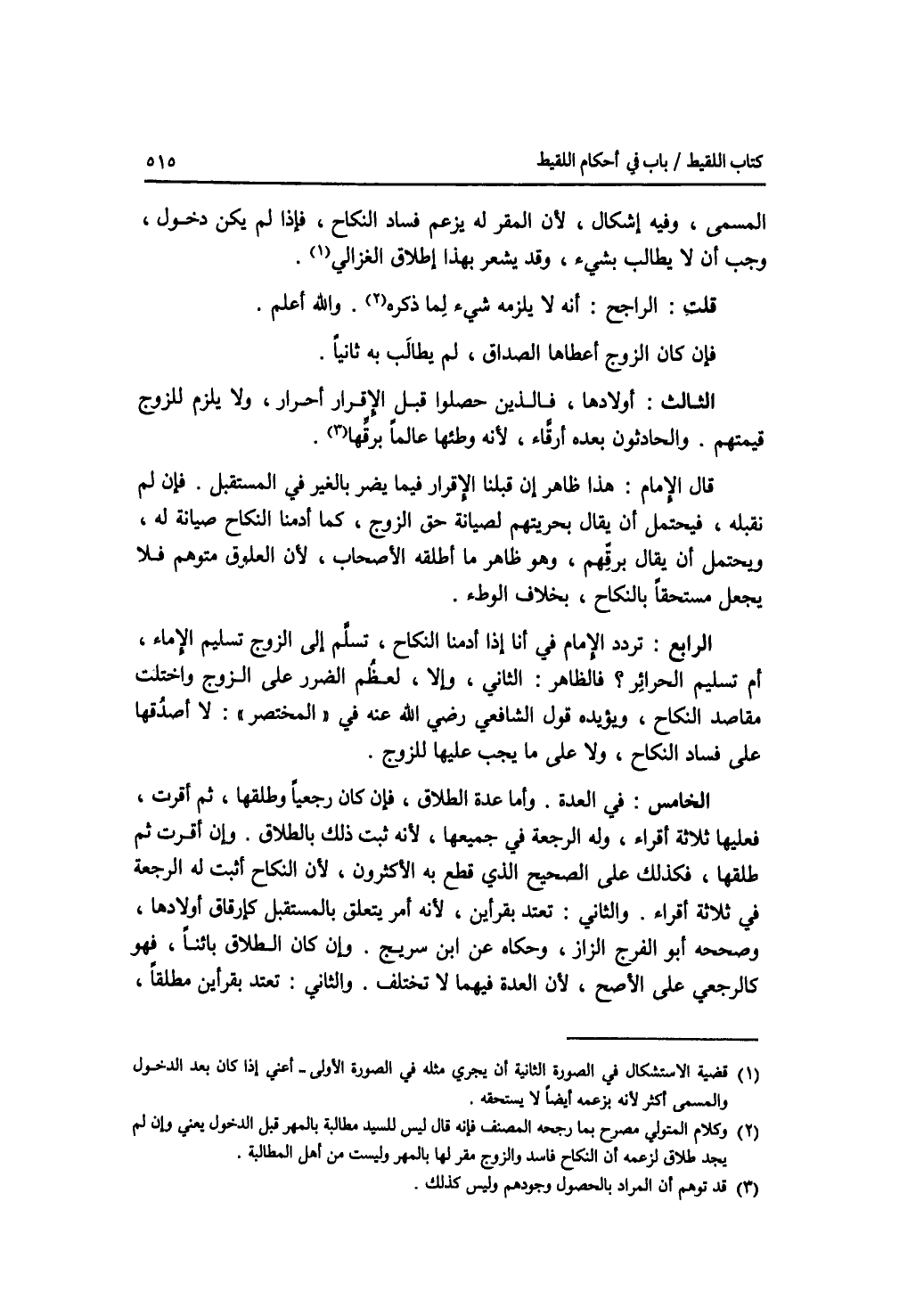المسمى، وفيه إشكال، لان المقر له يزعم فساد النكاح، فإذا لم يكن دخول، وجب أن لا يطالب بشئ، وقد يشعر بهذا إطلاق الغزالي. قلت: الراجح: أنه لا يلزمه شئ لما ذكره. والله أعلم فإن كان الزوج أعطاها الصداق، لم يطالب به ثانيا. الثالث: أولادها، فالذين حصلوا قبل الاقرار أحرار، ولا يلزم للزوج قيمتهم. والحادثون بعده أرقاء، لانه وطئها عالما برقها. قال الامام: هذا ظاهر إن قبلنا الاقرار فيما يضر بالغير في المستقبل. فإن لم نقبله، فيحتمل أن يقال بحريتهم لصيانة حق الزوج، كما أدمنا النكاح صيانة له، ويحتمل أن يقال برقهم، وهو ظاهر ما أطلقه الاصحاب، لان العلوق الرابع: تردد الامام في أنا إذا متوهم فلا يجعل مستحقا بالنكاح، بخلاف الوطئ الرابع أدمنا النكاح، تسلم إلى الزوج تسليم الاماء، أم تسليم الحرائر ؟ فالظاهر: الثاني، وإلا، لعظم الضرر على الزوج واختلت مقاصد النكاح، ويؤيده قول الشافعي رضي الله عنه في المختصر: لا أصدقها على فساد النكاح، ولا على ما يجب عليها للزوج. الخامس: في العدة. وأما عدة الطلاق، فإن كان رجعيا وطلقها، ثم أقرت، فعليها ثلاثة أقراء، وله الرجعة في جميعها، لانه ثبت ذلك بالطلاق. وإن أقرت ثم طلقها، فكذلك على الصحيح الذي قطع به الاكثرون، لان النكاح أثبت له الرجعة في ثلاثة أقراء. والثاني: تعتد بقرئين، لانه أمر يتعلق بالمستقبل كارقاق أولادها، وصححه أبو الفرج الزاز، وحكاه عن ابن سريج. وإن كان الطلاق بائنا، فهو كالرجعي على الاصح، لان العدة فيهما لا تختلف. والثاني: تعتد بقرئين مطلقا،