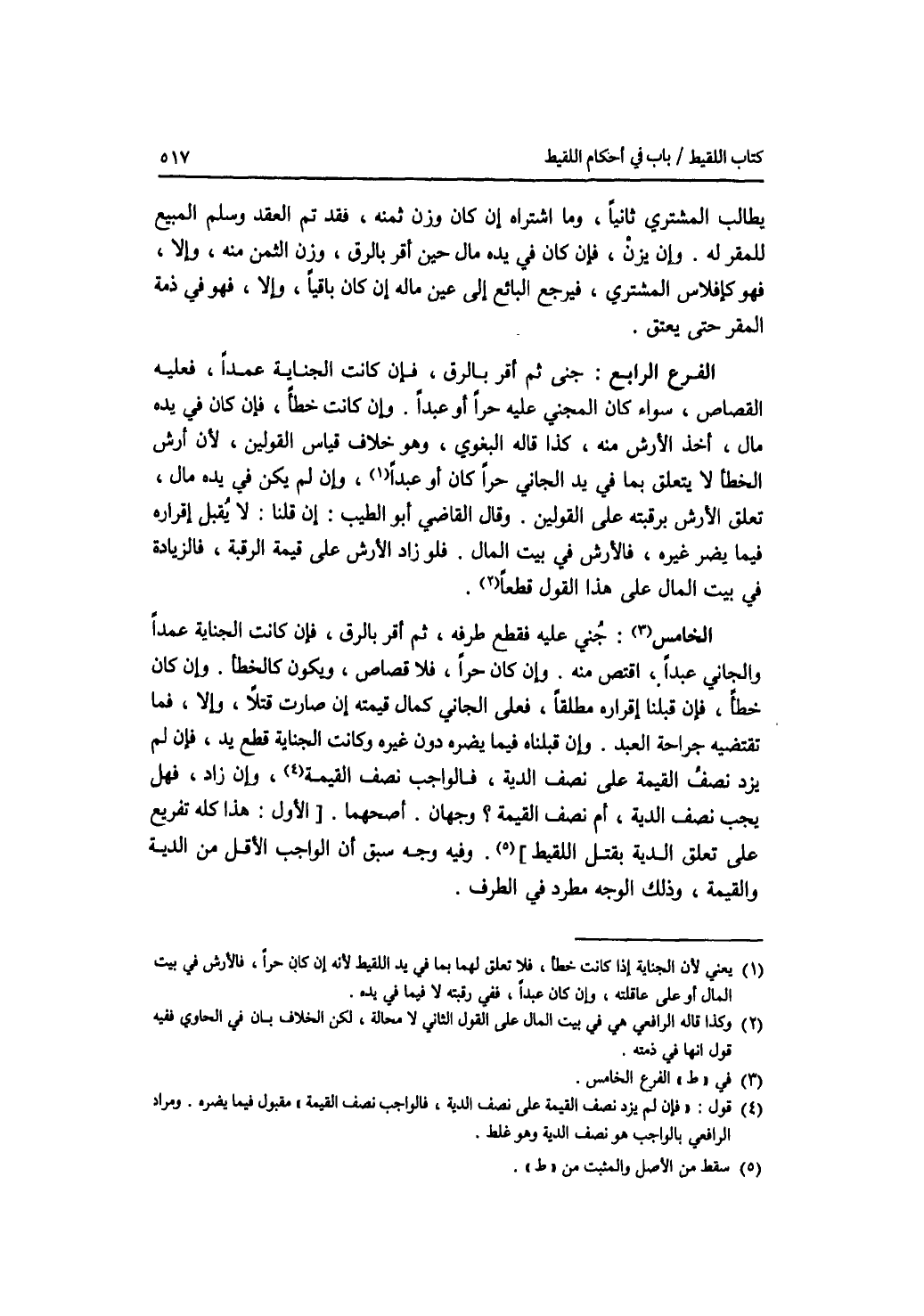 يطالب المشتري ثانيا، وما اشتراه إن كان وزن ثمنه، فقد تم العقد وسلم المبيع للمقر له. وإن لم يزن، فان كان في يده مال حين أقر بالرق، وزن الثمن منه، وإلا، فهو كافلاس المشتري، فيرجع البائع إلى عين ماله إن كان باقيا، وإلا، فهو في ذمة المقر حتى يعتق. الفرع الرابع: جنى ثم أقر بالرق، فان كانت الجناية عمدا، فعليه القصاص، سواء كان المجني عليه حرا أو عبدا. وإن كانت خطأ، فان كان في يده مال، أخذ ارش منه، كذا قاله البغوي، وهو خلاف قياس القولين، لان أرش الخطأ لا يتعلق بما في يد الجاني حرا كان أو عبدا، وإن لم يكن في يده مال، تعلق الارش برقبته على القولين. وقال القاضي أبو الطيب: إن قلنا: لا يقبل إقراره فيما يضر غيره، فالارش في بيت المال. فلو زاد الارش على قيمة الرقبة، فالزيادة في بيت المال على هذا القول قطعا. الفرع الخامس: جني عليه فقطع طرفه، ثم أقر بالرق، فان كانت الجناية عمدا والجاني عبدا، اقتص منه. وإن كان حرا، فلا قصاص، ويكون كالخطأ. وإن كانت خطأ، فان قبلنا إقراره مطلقا، فعلى الجاني كمال قيمته إن صارت قتلا، وإلا، فما تقتضيه جراحة العبد. وإن قبلناه فيما يضره دون غيره وكانت الجناية قطع يد، فان لم يزد نصف القيمة على نصف الدية، فالواجب نصف القيمة، وإن زاد، فهل يجب نصف الدية، أم نصف القيمة ؟ وجهان. أصحهما: الاول. هذا كله تفريع على تعلق الدية بقتل اللقيط. وفيه وجه سبق أن الواجب الاقل من الدية والقيمة، وذلك الوجه مطرد في الطرف.