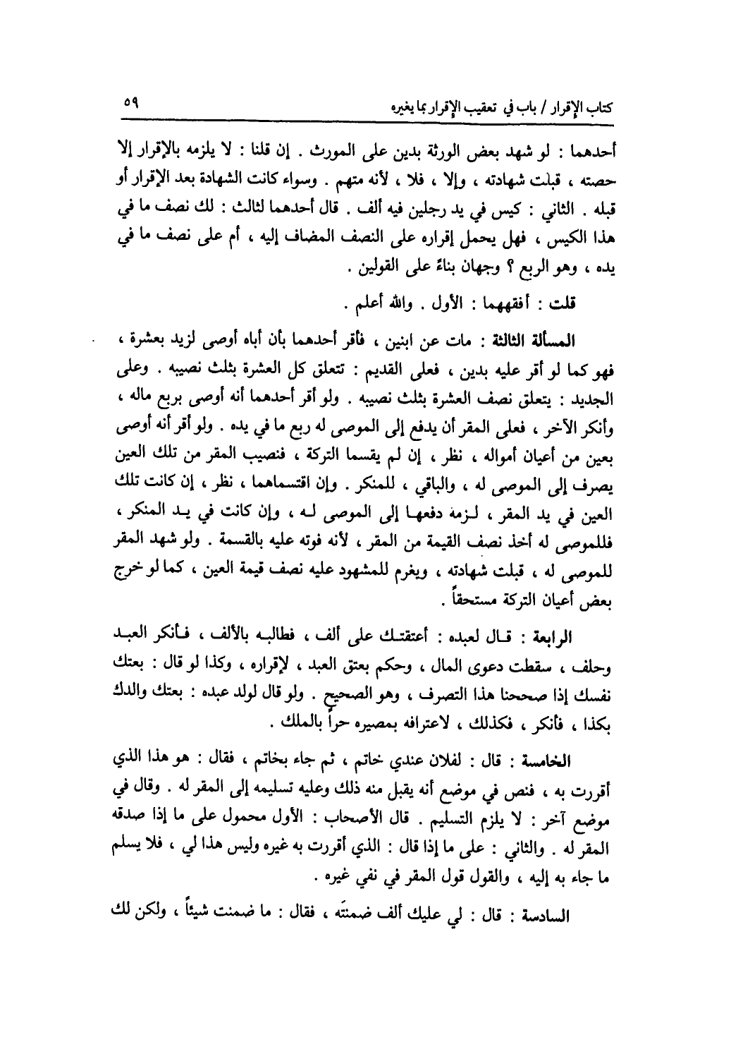 أحدهما: لو شهد بعض الورثة بدين على المور ث. إن قلنا: لا يلزمه بالاقرار إلا حصته، قبلت شهادته، وإلا، فلا، لانه متهم. وسواء كانت الشهادة بعد الاقرار أو قبله. الثاني: كيس في يد رجلين فيه ألف. قال أحدهما لثالث: لك نصف ما في هذا الكيس، فهل يحمل إقراره على النصف المضاف إليه، أم على نصف ما في يده، وهو الربع ؟ وجهان بناء على القولين. قلت: أفقههما: الاول. والله أعلم. المسألة الثالثة: مات عن ابنين، فأقر أحدهما بأن أباه أوصى لزيد بعشرة، فهو كما (لو) أقر عليه بدين، فعلى القديم: تتعلق كل العشرة بثلث نصيبه. وعلى الجديد: يتعلق نصف العشرة بثلث نصيبه. ولو أقر أحدهما أنه أوصى بربع ماله، وأنكر الآخر، فعلى المقر أن يدفع إلى الموصى له ربع ما في يده. ولو أقر أنه أوصى بعين من أعيان أمواله، نظر، إن لم يقسما التركة، فنصيب المقر من تلك العين يصرف إلى الموصى له، والباقي، للمنكر. وإن اقتسماهما، نظر، إن كانت تلك العين في يد المقر، لزمه دفعها إلى الموصى له، وإن كانت في يد المنكر، فللموصى له أخذ نصف القيمة من المقر، لانه فوته عليه بالقسمة. ولو شهد المقر للموصى له، قبلت شهادته، ويغرم للمشهود عليه نصف قيمة العين، كما لو خرج بعض أعيان التركة مستحقا. الرابعة: قال لعبده: أعتقتك على ألف، فطالبه بالالف، فأنكر العبد وحلف، سقطت دعوى المال، وحكم بعتق العبد، لاقراره، وكذا لو قال: بعتك نفسك إذا صححنا هذا التصرف، وهو الصحيح. ولو قال لولد عبده: بعتك والدك بكذا، فأنكر، فكذلك، لاعترافه بمصيره حرا بالملك. الخامسة: قال: لفلان عندي خاتم، ثم جاء بخاتم، فقال: هو هذا الذي أقررت به، فنص في موضع أنه يقبل منه ذلك وعليه تسليمه إلى المقر له. وقال في موضع آخر: لا يلزم التسليم. قال الاصحاب: الاول محمول على ما إذا صدقه المقر له. والثاني: على ما إذا قال: الذي أقررت به غيره وليس هذا لي، فلا يسلم ما جاء به إليه. والقول قول المقر في نفي غيره. السادسة: قال: لي عليك ألف ضمنته، فقال: ما ضمنت شيئا، ولكن لك
