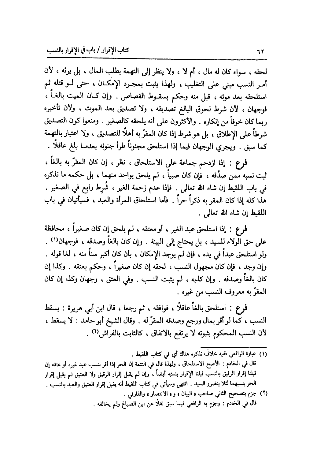 لحقه، سواء كان له مال، أم لا، ولا ينظر إلى التهمة بطلب المال، بل يرثه، لان أمر النسب مبني على التغليب، ولهذا يثبت بمجرد الامكان، حتى لو قتله ثم استلحقه بعد موته، قبل منه وحكم بسقوط القصاص. وإن كان الميت بالغا، فوجهان، لان شرط لحوق البالغ تصديقه، ولا تصديق بعد الموت، ولان تأخيره ربما كان خوفا من إنكاره. والاكثرون على أنه يلحقه كالصغير. ومنعوا كون التصديق شرطا على الاطلاق، بل هو شرط إذا كان المقر به أهلا للتصديق، ولا اعتبار بالتهمة كما سبق. ويجري الوجهان فيما إذا استلحق مجنونا طرأ جنونه بعد ما بلغ عاقلا. فرع إذا ازدحم جماعة على الاستلحاق، نظر، إن كان المقر به بالغا، ثبت نسبه ممن صدقه، فإن كان صبيا، لم يلحق بواحد منهما، بل حكمه ما نذكره في باب اللقيط إن شاء الله تعالى. فإذا عدم زحمة الغير، شرط رابع في الصغير. هذا كله إذا كان المقر به ذكرا حرا. فأما استلحاق المرأة والعبد، فسيأتيان في باب اللقيط إن شاء الله تعالى. فرع إذا استلحق عبد الغير، أو معتقه، لم يلحق إن كان صغيرا، محافظة على حق الولاء للسيد، بل يحتاج إلى البينة. وإن كان بالغا وصدقه، فوجهان. ولو استلحق عبدا في يده، فإن لم يوجد الامكان، بأن كان أكبر سنا منه، لغا قوله. وإن وجد، فإن كان مجهول النسب، لحقه إن كان صغيرا، وحكم بعتقه. وكذا إن كان بالغا وصدقه. وإن كذبه، لم يثبت (النسب). وفي العتق، وجهان. وكذا إن كان المقر به معروف النسب من غيره. فرع استلحق بالغا عاقلا، فوافقه، ثم رجعا، قال ابن أبي هريرة: يسقط النسب، كما لو أقر بمال ورجع وصدقه المقر له. وقال الشيخ أبو حامد: لا يسقط، لان النسب المحكوم بثبوته لا يرتفع بالاتفاق، كالثابت بالفراش.
