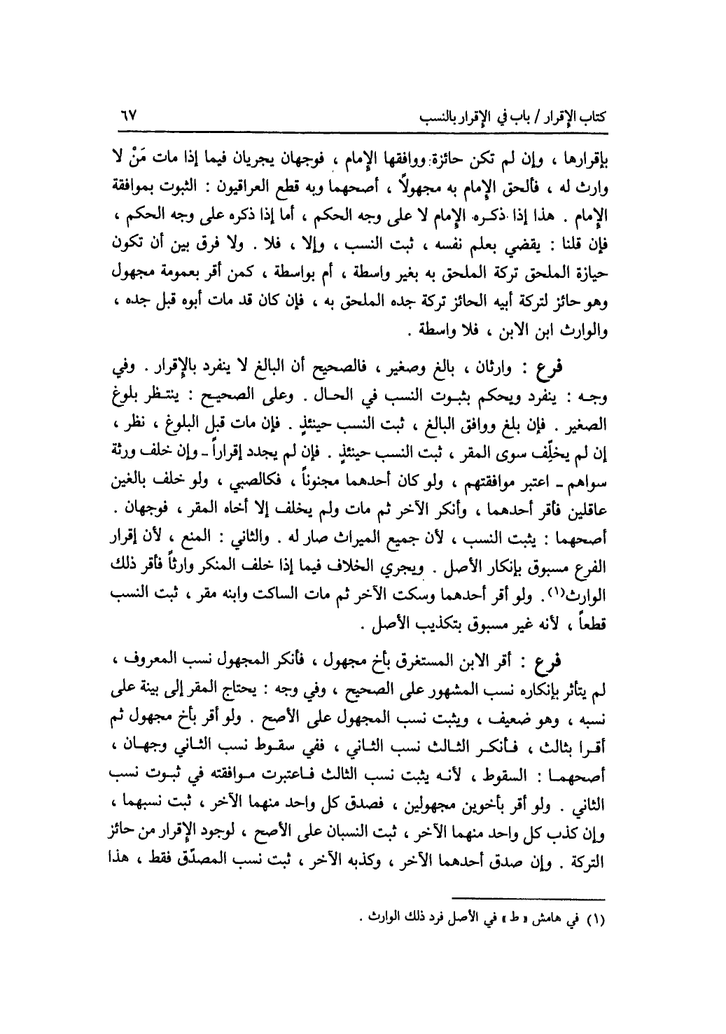 إقرارها، وإن لم تكن حائزة ووافقها الامام، فوجهان يجريان فيما إذا مات من لا وارث له، فألحق الامام به مجهولا، أصحهما وبه قطع العراقيون: الثبوت بموافقة الامام. هذا إذا ذكره الامام لا على وجه الحكم، أما إذا ذكره على وجه الحكم، فإن قلنا: يقضي بعلم نفسه، ثبت النسب، وإلا، فلا. ولا فرق بين أن تكون حيازة الملحق تركة الملحق به بغير واسطة، أم بواسطة، كمن أقر بعمومة مجهول وهو حائز لتركة أبيه الحائز تركة جده الملحق به، فإن كان قد مات أبوه قبل جده، والوارث ابن الاب، فلا واسطة. فرع وارثان، بالغ وصغير، فالصحيح أن البالغ لا ينفرد بالاقرار وفي وجه: ينفرد ويحكم بثبوت النسب في الحال. وعلى الصحيح: ينتظر بلوغ الصغير. فإن بلغ ووافق البالغ، ثبت النسب حينئذ. فإن مات قبل البلوغ، نظر، إن لم يخلف سوى المقر، ثبت النسب حينئذ. فإن لم يجدد إقرارا - وإن خلف ورثة سواهم - اعتبر موافقتهم، ولو كان أحدهما مجنونا، فكالصبي. ولو خلف بالغين عاقلين فأقر أحدهما، وأنكر الآخر ثم مات ولم يخلف إلا أخاه المقر، فوجهان. أصحهما: يثبت النسب، لان جميع الميراث صار له. والثاني: المنع، لان إقرار الفرع مسبوق بإنكار الاصل. ويجري الخلاف فيما إذا خلف المنكر وارثا فأقر ذلك الوارث. ولو أقر أحدهما وسكت الآخر ثم مات الساكت وابنه مقر، ثبت النسب قطعا، لانه غير مسبوق بتكذيب الاصل. فرع أقر الابن المستغرق بأخ مجهول، فأنكر المجهول نسب المعروف، لم يتأثر بإنكاره نسب المشهور على الصحيح، وفي وجه: يحتاج المقر إلى بينة على نسبه، وهو ضعيف، ويثبت نسب المجهول على الاصح. ولو أقر بأخ مجهول ثم أقرا بثالث، فأنكر الثالث نسب الثاني، ففي سقوط نسب الثاني وجهان، أصحهما: السقوط، لانه يثبت نسب الثالث فاعتبرت موافقته في ثبوت نسب الثاني. ولو أقر بأخوين مجهولين، فصدق كل واحد منهما الآخر، ثبت نسبهما، وإن كذب كل واحد منهما الآخر، ثبت النسبان على الاصح، لوجود الاقرار من حائز التركة. وإن صدق أحدهما الآخر، وكذبه الآخر، ثبت نسب المصدق فقط، هذا