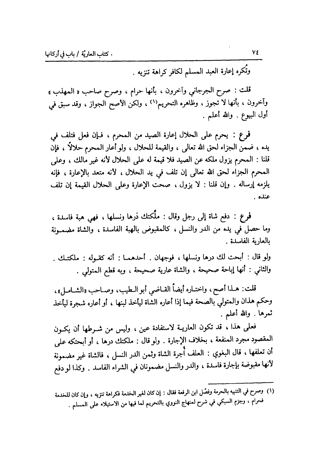 وتكره إعارة العبد المسلم لكافر كراهة تنزيه. قلت: صرح الجرجاني وآخرون، بأنها حرام، وصرح صاحب المهذب وآخرون، بأنها لا تجوز، وظاهره التحريم، ولكن الاصح الجواز، وقد سبق في أول البيوع. والله أعلم. فرع يحرم على الحلال إعارة الصيد من المحرم، فإن فعل فتلف في يده، ضمن الجزاء لحق الله تعالى، والقيمة للحلال. ولو أعار المحرم حلالا، فإن نا: المحرم يزول ملكه عن الصيد فلا قيمة له على الحلال لانه غير مالك، وعلى المحرم الجزاء لحق الله تعالى إن تلف في يد الحلال، لانه متعد بالاعارة، فإنه يلزمه إرساله. وإن قلنا: لا يزول، صحت الاعارة وعلى الحلال القيمة إن تلف عنده. فرع دفع شاة إلى رجل وقال: ملكتك درها ونسلها، فهي هبة فاسدة، وما حصل في يده من الدر والنسل، كالمقبوض بالهبة الفاسدة، والشاة مضمونة بالعارية الفاسدة. ولو قال: أبحت لك درها ونسلها، فوجهان. أحدهما: أنه كقوله: ملكتك. والثاني: أنها إباحة صحيحة، والشاة عارية صحيحة، وبه قطع المتولي. قلت: هذا أصح، واختاره أيضا القاضي أبو الطيب، وصاحب الشامل، وحكم هذان والمتولي بالصحة فيما إذا أعاره الشاة ليأخذ لبنها، أو أعاره شجرة ليأخذ ثمرها. والله أعلم. فعلى هذا، قد تكون العارية لاستفادة عين، وليس من شرطها أن يكون المقصود مجرد المنفعة، بخلاف الاجارة. ولو قال: ملكتك درها، أو أبحتكه على أن تعلفها، قال البغوي: العلف أجرة الشاة وثمن الدر والنسل، فالشاة غير مضمونة لانها مقبوضة بإجارة فاسدة، والدر والنسل مضمو نان في الشراء الفاسد. وكذا لو دفع