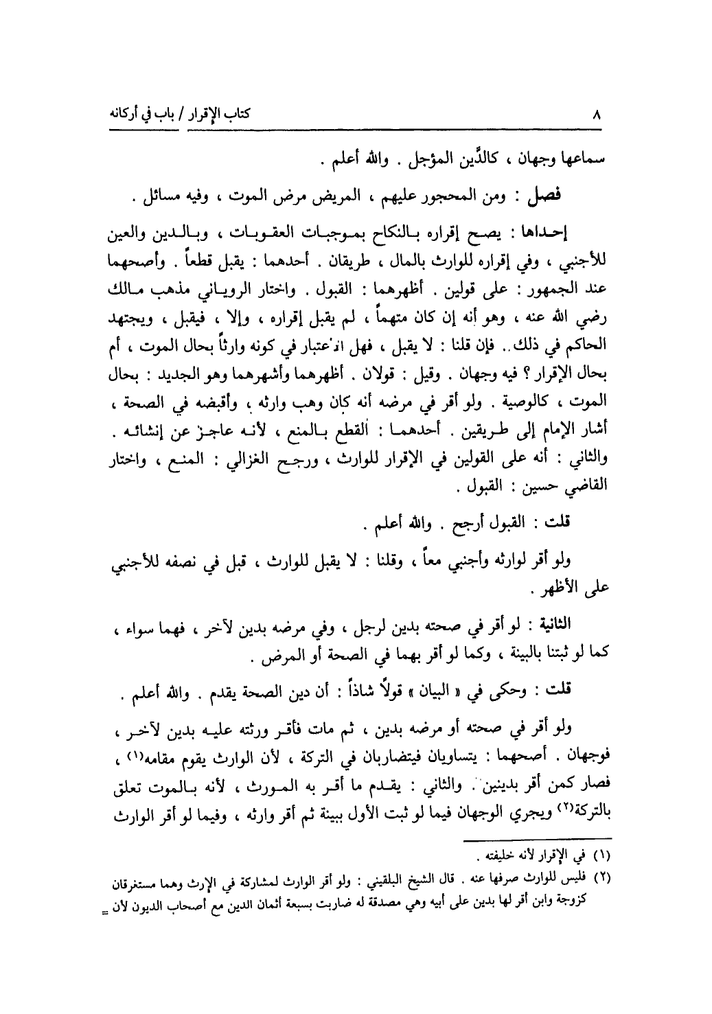 فصل ومن المحجور عليهم، المريض مرض الموت، وفيه مسائل. إحداها: يصح إقرار بالنكاح بموجبات العقوبات، وبالدين والعين للاجنبي، وفي إقراره للوارث بالمال، طريقان. أحدهما: يقبل قطعا. وأصحهما عند الجمهور: على قولين. أظهرهما: القبول. واختار الروياني مذهب مالك رضي الله عنه، وهو أنه إن كان متهما، لم يقبل إقراره، وإلا، فيقبل، ويجتهد الحاكم في ذلك. فإن قلنا: لا يقبل، فهل الاعتبار في كونه وارثا بحال الموت، أم بحال الاقرار ؟ فيه وجهان. وقيل: قولان. أظهرهما وأشهرهما وهو الجديد: بحال الموت، كالوصية. ولو أقر في مرضه أنه كان وهب وارثه، وأقبضه في الصحة، أشار الامام إلى طريقين. أحدهما: القطع بالمنع، لانه عاجز عن انشائه. والثاني: أنه على القولين في الاقرا للوارث، ورجح الغزالي: المنع، واختار القاضي حسين: القبول. قلت: القبول أرجح. والله أعلم. ولو أقر لوارثه وأجنبي معا، وقلنا: لا يقبل للوارث، قبل في نصفه للاجنبي على الاظهر. الثانية: لو أقر في صحته بدين لرجل، وفي مرضه بدين لآخر، فهما سواء، كما لو ثبتا بالبينة، وكما لو أقر بهما في الصحة أو المرض. قلت: وحكى في البيان قولا شاذا: أن دين الصحة يقدم. والله أعلم. ولو أقرفي صحته أو مرضه بدين، ثم مات فأقر ورثته عليه بدين لآخر، فوجهان. أصحهما يتساويان فيتضاربان في التركة، لان الوارث يقوم مقامه، فصار كمن أقر بدينين. والثاني: يقدم ما أقر به المورث، لانه بالموت تعلق بالتركة ويجري الوجهان فيما لو ثبت الاول ببينة ثم أقر وارثه، وفيما لو أقر الوارث