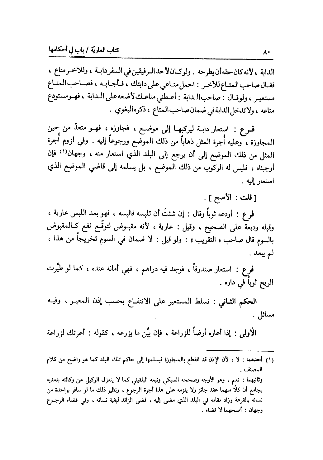 الدابة، لانه كان حقه أن يطرحه. ولو كان لاحد الرفيقين في السفر دابة، وللآخر متاع، فقال صاحب المتاع للآخر: احمل متاعي على دابتك، فأجابه، فصاحب المتاع مستعير، ولو قال: صاحب الدابة: أعطني متاعك لاضعه على الدابة، فهو مستودع متاعه، ولا تدخل الدابة في ضمان صاحب المتاع، ذكره البغوي. فرع استعار دابة ليركبها إلى موضع، فجاوزه، فهو متعد من حين المجاوزة، وعليه أجرة المثل ذهابا من ذلك الموضع ورجوعا إليه. وفي لزوم أجرة المثل من ذلك الموضع إلى أن يرجع إلى البلد الذي استعار منه، وجها ن. فإن أوجبناها، فليس له الركوب من ذلك الموضع، بل يسلمه إلى قاضي الموضع الذي استعار إليه. قلت: الاصح. فرع أودعه ثوبا وقال: إن شئت أن تلبسه فالبسه، فهو بعد اللبس عارية، وقبله وديعة على الصحيح، وقيل: عارية، لانه مقبوض لتوقع نفع كالمقبوض بالسوم. قال صاحب التقريب: ولو قيل: لا ضمان في السوم تخريجا من هذا، لم يبعد. فرع استعار صندوقا، فوجد فيه دراهم، فهي أمانة عنده، كما لو طيرت الريح ثوبا في داره. الحكم الثاني: تسلط المستعير على الانتفاع بحسب إذن المعير، وفيه مسائل. الاولى: إذا أعاره أرضا للزراعة، فإن بين ما يزرعه، كقوله: أعرتك لزراعة