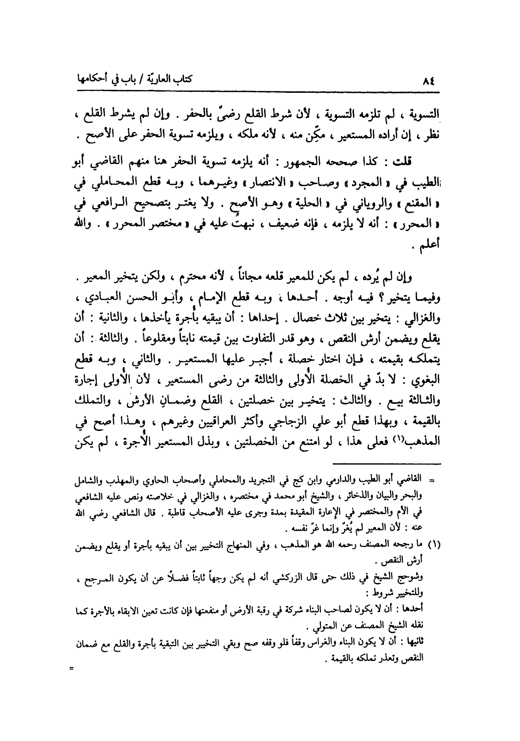 التسوية، لم تلزمه التسوية، لان شرط القلع رضى بالحفر. وإن لم يشرط القلع، نظر، إن أراده المستعير، مكن منه، لانه ملكه، ويلزمه تسوية الحفر على الاصح. قلت: كذا صححه الجمهور: أنه يلزمه تسوية الحفر هنا منهم القاضي أبو الطيب في المجرد وصاحب الانتصار وغيرهما، وبه قطع المحاملي في المقنع والروياني في الحلية وهو الاصح. ولا يغتر بتصحيح الرافعي في المحرر: أنه لا يلزمه، فإنه ضعيف، نبهت عليه في مختصر المحرر. والله أعلم. وإن لم يرده، لم يكن للمعير قلعه مجانا، لانه محترم، ولكن يتخير المعير. وفيما يتخير ؟ فيه أوجه. أحدها، وبه قطع الامام، وأبو الحسن العبادي، والغزالي: يتخير بين ثلاث خصال. إحداها: أن يبقيه بأجرة يأخذها. والثانية: أن يقلع ويضمن أرش النقص، وهو قدر التفاوت بين قيمته نابتا ومقلوعا. والثالثة: أن يتملكه بقيمته، فإن اختار خصلة، أجبر عليها المستعير. والثاني، وبه قطع البغوي: لا بد في الخصلة الاولى والثالثة من رضى المستعير، لان الاولى إجارة والثالثة بيع. والثالث: يتخير بين خصلتين، القلع وضمان الارش، والتملك بالقيمة، وبهذا قطع أبو علي الزجاجي وأكثر العراقيين وغيرهم، وهذا أصح في المذهب. فعلى هذا، لو امتنع من الخصلتين، وبذل المستعير الاجرة، لم يكن