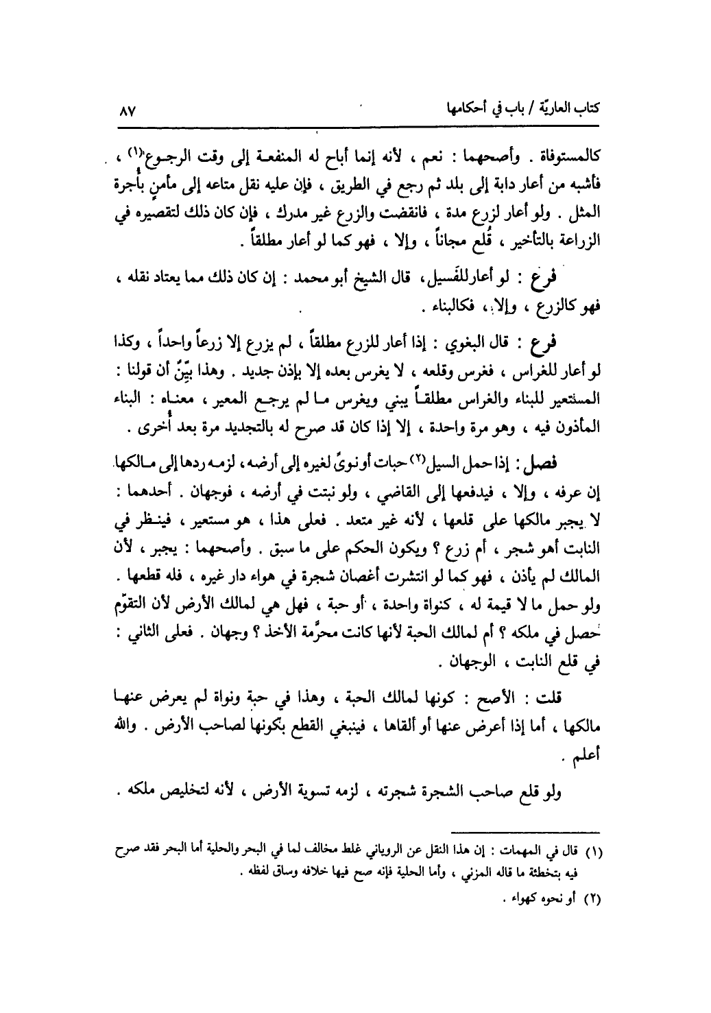 كالمستوفاة. وأصحهما: نعم، لانه إنما أباح له المنفعة إلى وقت الرجوع، فأشبه من أعار دابة إلى بلد ثم رجع في الطريق، فإن عليه نقل متاعه إلى مأمن بأجرة المثل. ولو أعار لزرع مدة، فانقضت والزرع غير مدرك، فإن كان ذلك لتقصيره في الزراعة بالتأخير، قلع مجانا، وإلا، فهو كما لو أعار مطلقا. فرع لو أعار للفسيل، قال الشيخ أبو محمد: إن كان ذلك مما يعتاد نقله، فهو كالزرع، وإلا، فكالبناء. فرع قال البغوي: إذا أعار للزرع مطلقا، لم يزرع إلا زرعا واحدا، وكذا لو أعار للغراس، فغرس وقلعه، لا يغرس بعده إلا بإذن جديد وهذا بين أن قولنا: المستعير للبناء والغراس مطلقا يبني ويغرس ما لم يرجع المعير، معناه: البناء المأذون فيه، وهو مرة واحدة، إلا إذا كان قد صرح له بالتجديد مرة بعد أخرى. فصل إذا حمل السيل حبات أو نوى لغيره إلى أرضه، لزمه ردها إلى مالكها إن عرفه، وإلا، فيدفعها إلى القاضي، ولو نبتت في أرضه، فوجهان. أحدهما: لا يجبر مالكها على قلعها، لانه غير متعد. فعلى هذا، هو مستعير، فينظر في النابت أهو شجر، أم زرع ؟ ويكون الحكم على ما سبق. وأصحهما: يجبر، لان المالك لم يأذن، فهو كما لو انتشرت أغصان شجرة في هواء دار غيره، فله قطعها. ولو حمل ما لا قيمة له، كنواة واحدة، أو حبة، فهل هي لمالك الارض لان التقوم حصل في ملكه ؟ أم لمالك الحبة لانها كانت محرمة الاخذ ؟ وجهان. فعلى الثاني: في قلع النابت، الوجهان. قلت: الاصح: كونها لمالك الحبة، وهذا في حبة ونواة لم يعرض عنها مالكها، أما إذا أعرض عنها أو ألقاها، فينبغي القطع بكونها لصاحب الارض. والله أعلم. ولو قلع صاحب الشجرة شجرته، لزمه تسوية الارض، لانه لتخليص ملكه.