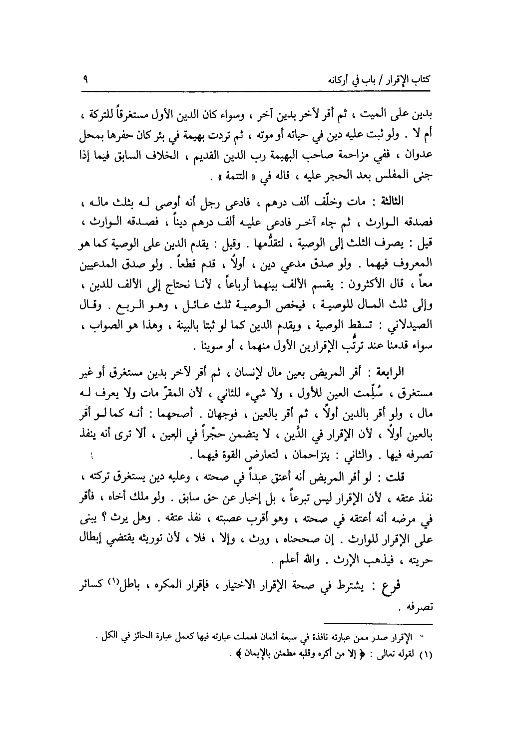 بدين على الميت، ثم أقر لآخر بدين آخر، وسواء كان الدين الاول مستغرقا للتركة، أم لا. ولو ثب ت عليه دين في حياته أو موته، ثم تردت بهيمة في بئر كان حفرها بمحل عدوان، ففي مزاحمة صاحب البهيمة رب الدين القديم، الخلاف السابق فيما إذا جنى المفلس بعد الحجر عليه، قاله في التتمة. الثالثة: مات وخلف ألف درهم، فادعى رجل أنه أوصى له بثلث ماله، فصدقه الوارث، ثم جاء آخر فادعى عليه ألف درهم دينا، فصدقه الوارث، قيل: يصرف الثلث إلى الوصية، لتقدمها. وقيل: يقدم الدين على الوصية كما هو المعروف فيهما. ولو صدق مدعي دين، أولا، قدم قطعا. ولصدق المدعيين معا، قال الاكثرون: يقسم الالف بينهما أرباعا، لانا نحتاج إلى الالف للدين، وإلى ثلث المال للوصية، فيخص الوصية ثلث عائل، وهو الربع. وقال الصيدلاني: تسقط الوصية، ويقدم الدين كما لو ثبتا بالبينة، وهذا هو الصواب، سواء قدمنا عند ترتب الاقرارين، الاول منهما، أو سوينا. الرابعة: أقر المريض بعين مال لانسان، ثم أقر لآخر بدين مستغرق أو غير مستغرق، سلمت العين للاول، ولا شئ للثاني، لان المقر مات ولا يعرف له مال. ولو أقر بالدين أولا، ثم أقر بالعين، فوجهان. أصحهما: أنه كما لو أقر بالعين أولا، لان الاقرار في الدين، لا يتضمن حجرا في العين، ألا ترى أنه ينفذ تصرفه فيها. والثاني يتزاحمان، لتعارض القوة فيهما. قلت: لو أقر المريض أنه أعتق عبدا في صحته، وعليه دين يستغرق تركته، نفذ عتقه، لان الاقرار ليس تبرعا، بل إخبار عن حق سابق. ولو ملك أخاه، فأقر في مرضه أنه أعتقه في صحته، وهو أقرب عصبته، نفذ عتقه. وهل يرث ؟ يبنى على الاقرار للوارث. إن صححناه، ورث، وإلا، فلا، لاتوريثه يقتضي إبطال حريته، فيذهب الارث. والله أعلم. فرع يشترط في صحة الاقرار الاختيار، فإقرار المكره، باطل كسائر تصرفه.
