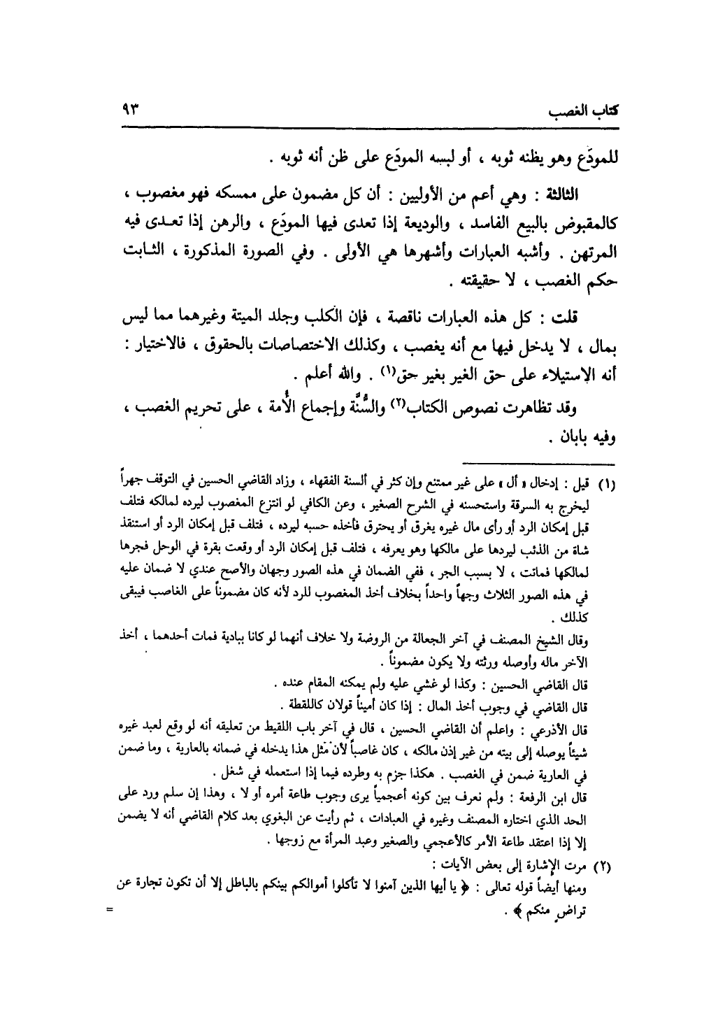 للمودع وهو يظنه ثوبه، أو لبسه المودع على ظن أنه ثوبه. الثالثة: وهي أعم من الاوليين: أن كل مضمون على ممسكه فهو مغصوب، كالمقبوض بالبيع الفاسد، والوديعة إذا تعدى فيها المودع، الرهن إذا تعدى فيه المرتهن. وأشبه العبارات وأشهرها هي الاولى. وفي الصورة المذكورة، الثابت حكم الغصب، لا حقيقته. قلت: كل هذه العبارات ناقصة، فإن الكلب وجلد الميتة وغيرهما مما ليس بمال، لا يدخل فيها مع أنه يغصب، وكذلك الاختصاصات بالحقوق، فالاختيار: أنه الاستيلاء على حق الغير بغير حق. والله أعلم. وقد تظاهرت نصوص الكتاب والسنة وإجماع الامة، على تحريم الغصب، وفيه بابان.
