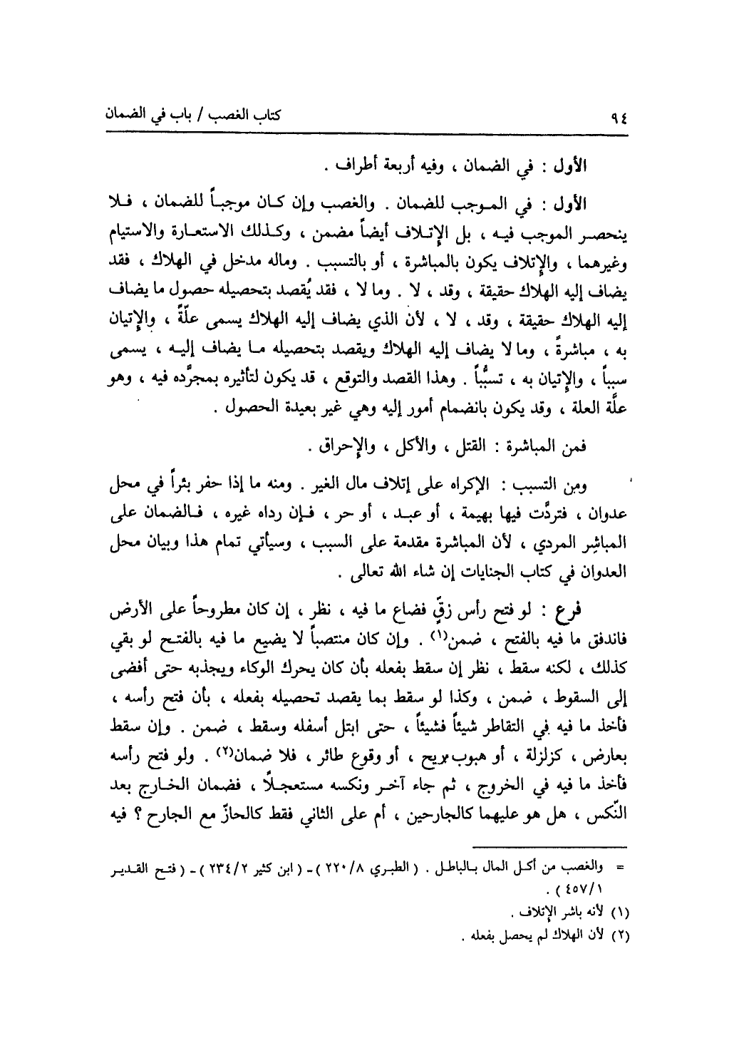 الاول : في الموجب للضمان، والغصب وإن كان موجبا للضمان، فلا ينحصر الموجب فيه، بل الاتلاف أيضمضمن، وكذلك الاستعارة والاستيام وغيرهما، والاتلاف يكون بالمباشرة، أو بالتسبب، وماله مدخل في الهلاك، فقد يضاف إليه الهلاك حقيقة، وقد، لا. ومالا، يقصد فقد بتحصيله حصول ما يضاف إليه الهلاك حقيقة، وقد، لا، لان الذي يضاف إليه الهلاك يسمى علة، والاتيان به، مباشرة، وما لا يضاف إليه الهلاك ويقصد بتحصيله ما يضاف إليه، يسمى سببا، والاتيان به، تسببا. وهذا القصد والتوقع، قد يكون لتأثيره بمجرده فيه، وهو علة العلة، وقد يكون بإنضمام أمور إليه وهي غير بعيدة الحصول. فمن المباشرة: القتل، والاكل، والاحراق. ومن التسبب: الاكراه على أتلاف مال الغير. ومنه ما إذا حفر بئرا في محل عدوان، فتردت فيها بهيمة، أو عبد، أو حر، فإن رداه غيره، فالضمان على المباشرة المردي، لان المباشر مقدمة على السبب، وسيأتي تمام هذا وبيان محل العدوان في كتاب الجنايات إن شاء الله تعالى. فرع لو فتح رأس زق فضاع ما فيه، نظر، إن كان (مطروحا) على الارض فاندفق ما فيه بالفتح، ضمن. وإن كان منتصبا لا يضيع ما فيه لو بقي كذلك، لكنه سقط، نظر إن سقط بفعله بأن كان يحرك الوكاء ويجذبه حتى أفضى إلى السقوط، ضمن، وكذا لو سقط بما يقصد تحصيله بفعله، بأن فتح رأسه، فأخذ ما فيه في التقاطر شيئا فشيئا، حتى ابتل أسفله وسقط، ضمن. وإن سقط بعارض، كزلزلة، أو هبوب ريح، أو وقوع طائر، فلا ضمان، ولو فتح رأسه فأخذ ما فيه في الخروج، ثم جاء آخر ونكسه مستعجلا، فضمان الخارج بعد النكس، هل هو عليهما كالجارحين، أم على الثاني فقط كالحاز مع الجارح ؟ فيه