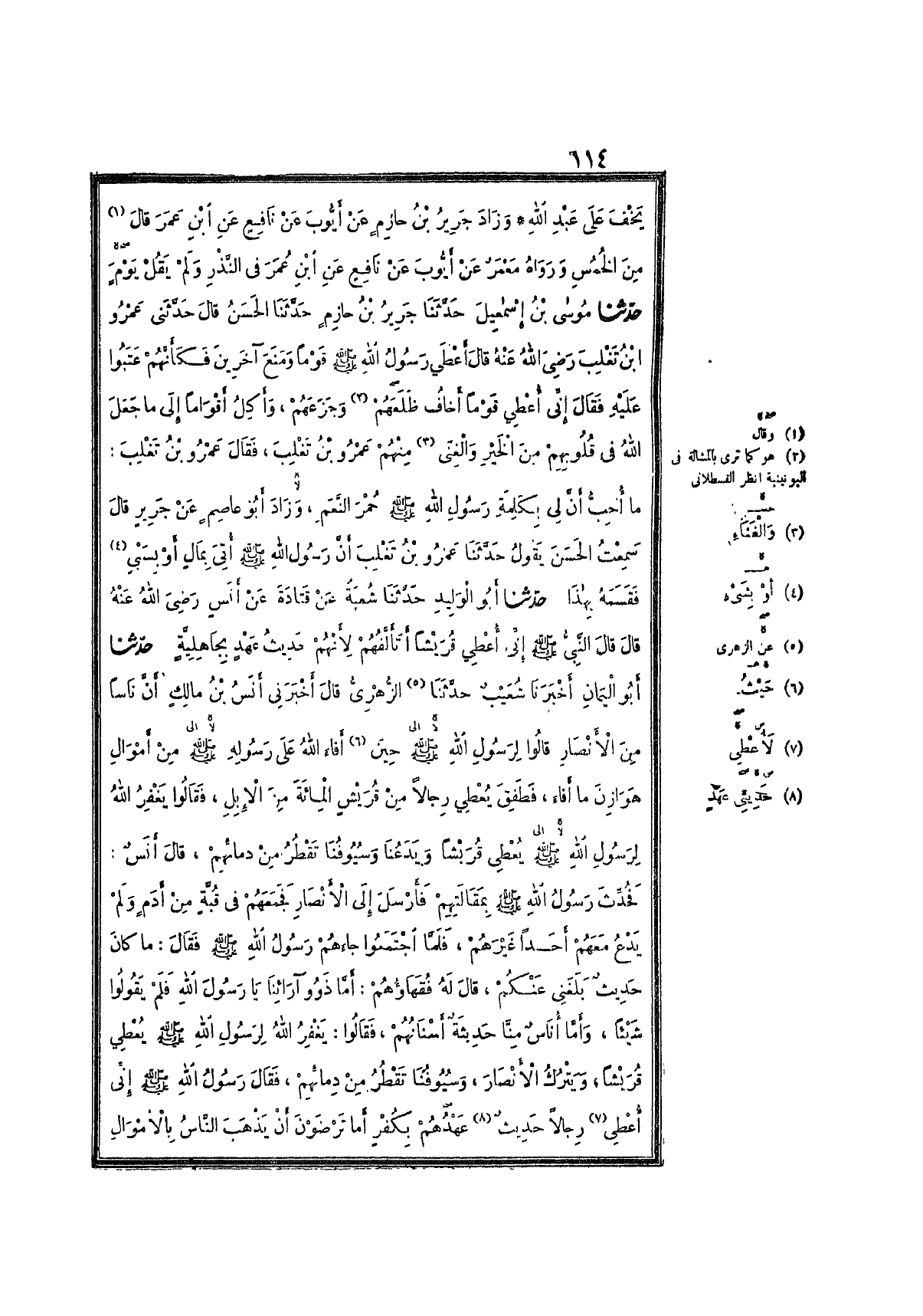 3145- حَدَّثَنَا مُوسَى بْنُ إِسْمَاعِيلَ ، حَدَّثَنَا جَرِيرُ بْنُ حَازِمٍ ، حَدَّثَنَا الحَسَنُ ، قَالَ : حَدَّثَنِي عَمْرُو بْنُ تَغْلِبَ ، رَضِيَ اللَّهُ عَنْهُ ، قَالَ : أَعْطَى رَسُولُ اللهِ صَلَّى اللَّهُ عَلَيْهِ وَسَلَّمَ قَوْمًا وَمَنَعَ آخَرِينَ ، فَكَأَنَّهُمْ عَتَبُوا عَلَيْهِ ، فَقَالَ : إِنِّي أُعْطِي قَوْمًا أَخَافُ ظَلَعَهُمْ وَجَزَعَهُمْ ، وَأَكِلُ أَقْوَامًا إِلَى مَا جَعَلَ اللَّهُ فِي قُلُوبِهِمْ مِنَ الخَيْرِ وَالغِنَى ، مِنْهُمْ عَمْرُو بْنُ تَغْلِبَ , فَقَالَ عَمْرُو بْنُ تَغْلِبَ : مَا أُحِبُّ أَنَّ لِي بِكَلِمَةِ رَسُولِ اللهِ صَلَّى اللَّهُ عَلَيْهِ وَسَلَّمَ حُمْرَ النَّعَمِ.