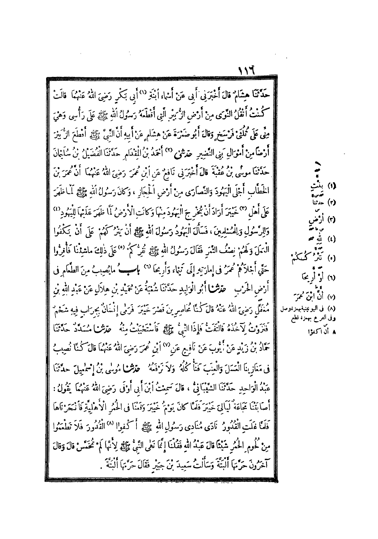 3152- حَدَّثَنِي أَحْمَدُ بْنُ المِقْدَامِ ، حَدَّثَنَا الفُضَيْلُ بْنُ سُلَيْمَانَ ، حَدَّثَنَا مُوسَى بْنُ عُقْبَةَ ، قَالَ : أَخْبَرَنِي نَافِعٌ ، عَنِ ابْنِ عُمَرَ ، رَضِيَ اللَّهُ عَنْهُمَا ؛ أَنَّ عُمَرَ بْنَ الخَطَّابِ أَجْلَى اليَهُودَ ، وَالنَّصَارَى مِنْ أَرْضِ الحِجَازِ ، وَكَانَ رَسُولُ اللهِ صَلَّى اللَّهُ عَلَيْهِ وَسَلَّمَ لَمَّا ظَهَرَ عَلَى أَهْلِ خَيْبَرَ ، أَرَادَ أَنْ يُخْرِجَ اليَهُودَ مِنْهَا ، وَكَانَتِ الأَرْضُ لَمَّا ظَهَرَ عَلَيْهَا لِلْيَهُودِ وَلِلرَّسُولِ وَلِلْمُسْلِمِينَ ، فَسَأَلَ اليَهُودُ رَسُولَ اللهِ صَلَّى اللَّهُ عَلَيْهِ وَسَلَّمَ أَنْ يَتْرُكَهُمْ عَلَى أَنْ يَكْفُوا العَمَلَ وَلَهُمْ نِصْفُ الثَّمَرِ ، فَقَالَ رَسُولُ اللهِ صَلَّى اللَّهُ عَلَيْهِ وَسَلَّمَ : نَتْرُكُكُمْ عَلَى ذَلِكَ مَا شِئْنَا ، فَأُقِرُّوا حَتَّى أَجْلاَهُمْ عُمَرُ فِي إِمَارَتِهِ إِلَى تَيْمَاءَ وَأَرِيحَاءَ.