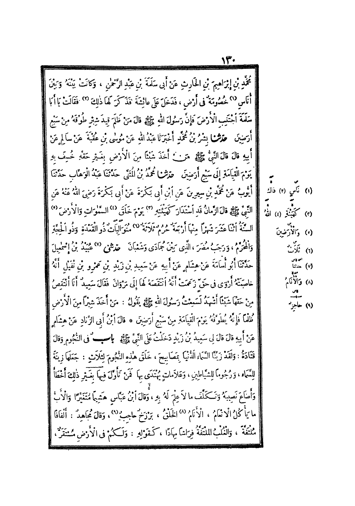 3198- حَدَّثَنَا عُبَيْدُ بْنُ إِسْمَاعِيلَ ، حَدَّثَنَا أَبُو أُسَامَةَ ، عَنْ هِشَامٍ ، عَنْ أَبِيهِ ، عَنْ سَعِيدِ بْنِ زَيْدِ بْنِ عَمْرِو بْنِ نُفَيْلٍ , أَنَّهُ خَاصَمَتْهُ أَرْوَى فِي حَقٍّ زَعَمَتْ أَنَّهُ انْتَقَصَهُ لَهَا إِلَى مَرْوَانَ ، فَقَالَ سَعِيدٌ : أَنَا أَنْتَقِصُ مِنْ حَقِّهَا شَيْئًا , أَشْهَدُ لَسَمِعْتُ رَسُولَ اللهِ صَلَّى اللَّهُ عَلَيْهِ وَسَلَّمَ يَقُولُ : مَنْ أَخَذَ شِبْرًا مِنَ الأَرْضِ ظُلْمًا ، فَإِنَّهُ يُطَوَّقُهُ يَوْمَ القِيَامَةِ مِنْ سَبْعِ أَرَضِينَ.