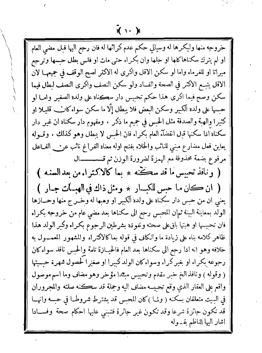 (ونافذ تحبيس ما قد سكنه ... بما كالاكتراء من بعد السنه)