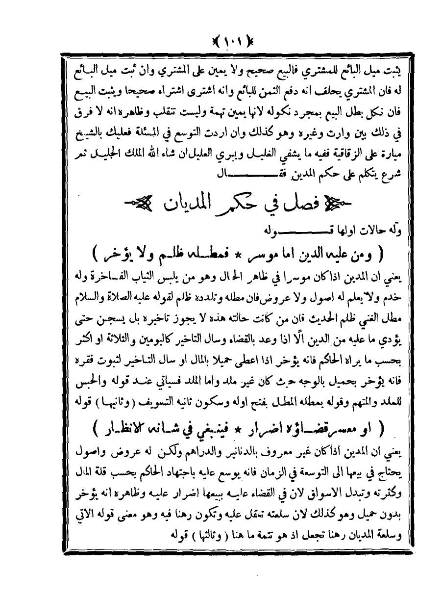 يثبت ميل البائع للمشتري فالبيع صحيح ولا يمين على المشتري وإن ثبت ميل البائع له فإن المشتري يحلف أنه دفع الثمن للبائع وأنه أشترى اشتراء صحيحًا ويثبت البيع فإن نكل بطل البيع بمجرد نكوله لأنها يمين تهمة وليست تنقلب وظاهره أنه لا فرق في ذلك بين وارث وغيره وهو كذلك وان اردت التوسع في المسألة فعليك بالشيخ ميارة على الزقاقية ففيه ما يشفي الغليل ويبري العليل إن شاء الله الملك الجليل ثم شرع يتكلم على حكم المدين فقال