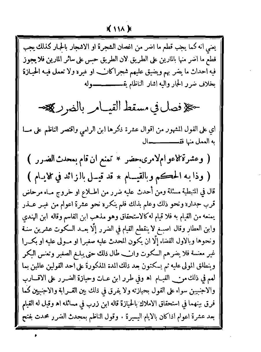قال في المتيطية مسألة ومن أحدث عليه ضرر من إطلاع أو خروج ماء مرحاض قرب جداره ونحو ذلك وعلم بذلك فلم ينكره نحو عشرة أعوام من غير عذر يمنعه من القيام به فلا قيام له كالاستحقاق وهو مذهب ابن القاسم وقاله ابن الهندي وابن العطار وقال أصبغ لا ينقطع القيام في الضرر إلا بعد السكوت عشرين سنة ونحوها وبالأول القضاء إلا أن يكون المحدث عليه صغيرًا أو مولى عليه أو بكرًا غير معنسة فلا يضرهم السكوت وإن طال ذلك حتى يبلغ الصغير وتعنس البكر وينطلق المولى عليه ثم يسكتون بعد ذلك المدة المذكورة على أحد القولين عالمين بما لهم في ذلك من القيام آهـ وفي طور ابن عات وحيازة الضرر على الأقارب والأجنبيين سواء على القول بحيازته ولا يفرق في ذلك بين القرابة والأجنبيين كما فرق بينهما في استحقاق الأملاك بالحيازة قاله ابن زرب في مسائله اهـ وقيل له القيام بعد عشرة أعوام إذا كان بالأيام اليسيرة. وقول الناظم بمحدث الضرر محدث بفتح