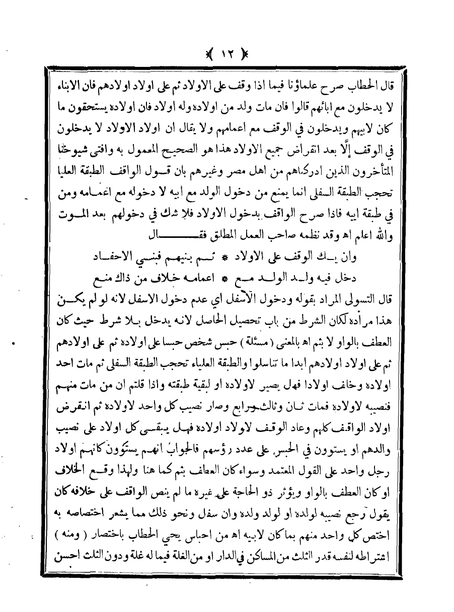قال الحطاب صرح علماؤنا فيما إذا وقف على الأولاد ثم على أولاد أولادهم فإن الأبناء لا يدخلون مع أبائهم قالوا فإن مات ولد من أولاده وله أولاد فإن أولاده يستحقون ما كان لأبيهم ويدخلون في الوقف مع أعمامهم ولا يقال أن أولاد الأولاد لا يدخلون في الوقف إلا بعد انقراض جميع الأولاد هذا هو الصحيح المعمول به وأفتى شيوخنا المتأخرون الذين أدركناهم من أهل مصر وغيرهم بأن قول الواقف الطبقة العليا تحجب الطبقة السفلى إنما يمنع من دخول الولد مع أبيه لا دخوله مع إغمامه ومن في طبقة أبيه فإذا صرح الواقف بدخول الأولاد فلا شك في دخولهم بعد الموت والله أعلم اهـ وقد نظمه صاحب العمل المطلق فقال