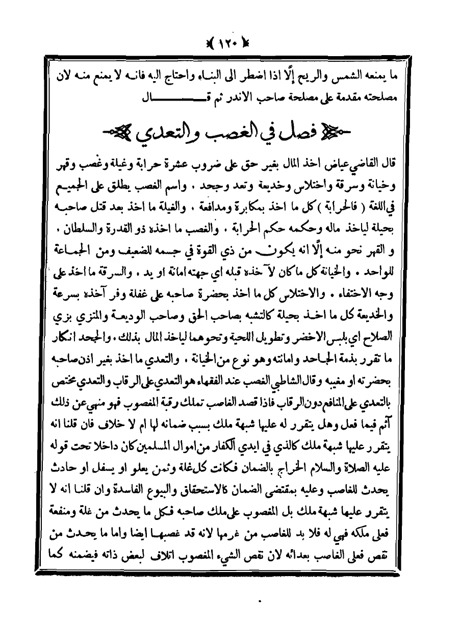 قال القاضي عياض أخذ المال بغير حق على ضروب عشرة حرابة وغيلة وغصب وقهر وخيانة وسرقة واختلاس وخديعة وتعد وجحد. وأسم الغصب يطلق على الجميع في اللغة (فالحرابة) كل ما أخذ بمكابرة ومدافعة. والغيلة ما أخذ بعد قتل صاحبه بحيلة ليأخذ ماله وحكمه حكم الحرابة. والغصب ما أخذه ذو القدرة والسلطان. والقهر نحو منه إلا إنه يكون من ذي القوة في جسمه للضعيف ومن الجماعة للواحد. والخيانة كل ما كان لآخذه قبله أي جهته أمانة أو يد. والسرقة ما أخذ على وجه الاختفاء. والاختلاس كل ما أخذ بحضرة صاحبه على غفلة وفر أخذه بسرعة والخديعة كل ما أخذ بحيلة كالتشبه بصاحب الحق وصاحب الوديعة والمتزي بزي الصلاح أي يلبس الأخضر وتطويل اللحية ونحوهما ليأخذ المال بذلك. والجحد إنكار ما تقرر بذمة الجاحد وأمانته وهو نوع من الخيانة, والتعدي ما أخذ بغير إذن صاحبه بحضرته أو مغيبه وقال الشاطبي الغصب عند الفقهاء هو التعدي على الرقاب والتعدي مختص بالتعدي على المنافع دون الرقاب فإذا قصد الغاصب تملك رقبة المغصوب فهو منهي عن ذلك إثم فيما فعل وهل يتقرر له عليها شبهة ملك بسبب ضمانه لها أم لا خلاف فإن قلنا إنه يتقرر عليها شبهة ملك كالذي في أيدي الكفار من أموال المسلمين كان داخلا تحت قوله عليه الصلاة والسلام الخراج بالضمان فكانت كل غلة وثمن يعلو أو يسفل أو حادث يحدث للغاصب وعليه بمقتضى الضمان كالاستحقاق والبيوع الفاسدة وإن قلنا أنه لا يتقرر عليه شبهة ملك بل المغصوب على ملك صاحبه فكل ما يحدث من غلة ومنفعة فعلى ملكه فهي له فلا بد للغاصب من غرمها لأنه قد غصبها أيضا وأما ما يحدث من نقص فعلى الغاصب بعدائه لأن نقص الشيء المغصوب إتلاف لبعض ذاته فيضمنه كما