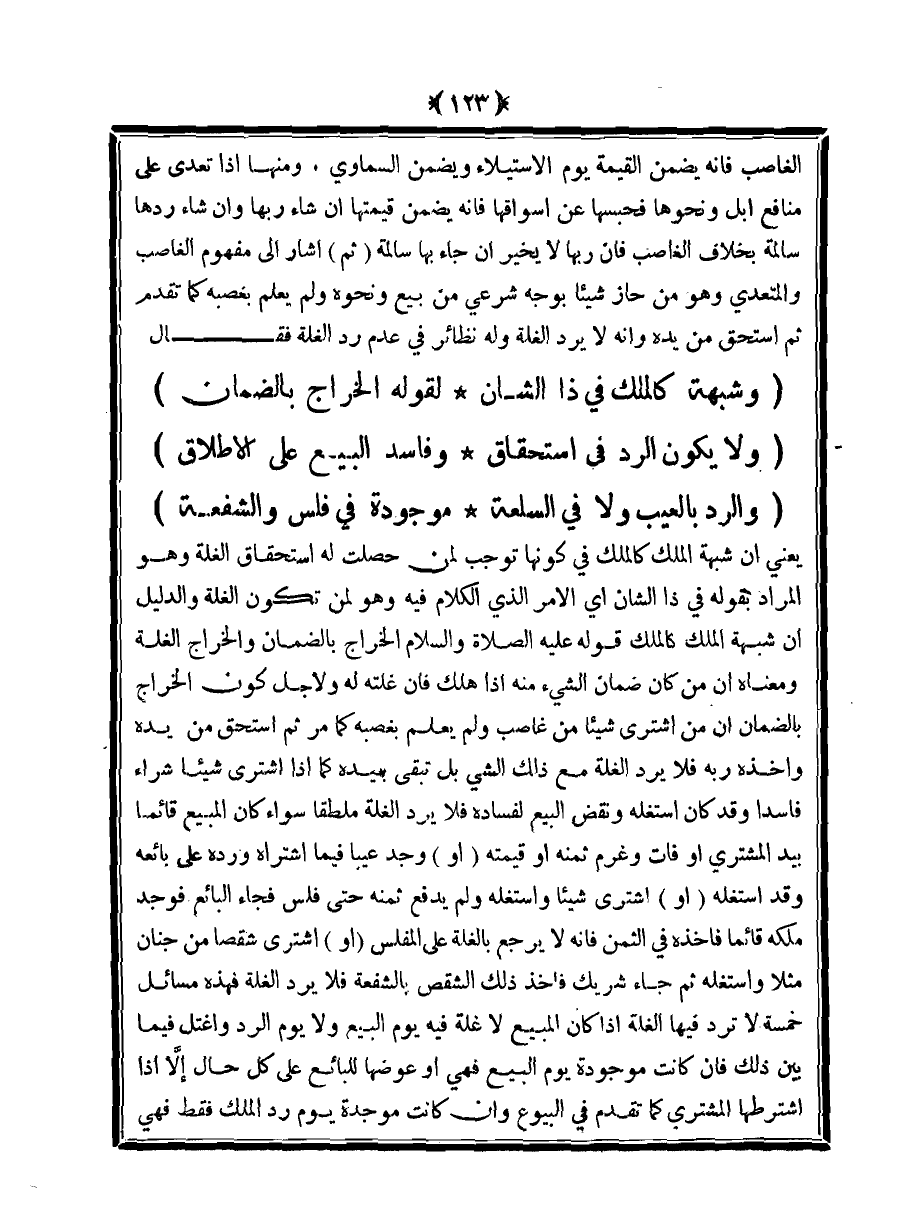 يعني أن شبهة الملك كالملك في كونها توجب لمن حصلت له استحقاق الغلة وهو المراد بقوله في ذا الشأن أي الأمر الذي الكلام فيه وهو لمن تكون الغلة والدليل أن شبهة الملك كالملك قوله عليه الصلاة والسلام الخراج بالضمان والخراج الغلة ومعناه أن من كان ضمان الشيء منه إذا هلك فإن غلته له ولأجل كون الخراج بالضمان أن من أشترى شيئًا من غاصب ولم يعلم بغصبه كما مر ثم استحق من يده وأخذه ربه فلا يرد الغلة مع ذلك الشيء بل تبقى بعيدة كما إذا أشترى شيئا شراء فاسدًا وقد كان استغله ونقض البيع لفساده فلا يرد الغلة مطلقا سواء كان المبيع قائما بيد المشتري أو فات وغرم ثمنه أو قيمته (أو) وجد عيبا فيما أشتراه ورده على بائعه وقد استغله (أو) اشترى شيئا واستغله ولم يدفع ثمنه حتى فلس فجاء البائع فوجد ملكه قائما فأخذه في الثمن فإنه لا يرجع بالغلة على المفلس (أو) اشترى شقصا من جنان مثلًا واستغله ثم جاء شريك فأخذ ذلك الشقص بالشفقة فلا يرد الغلة فهذه مسائل خمسة لا ترد فيها الغلة إذا كان المبيع لا غلة فيه يوم البيع ولا يوم الرد واعتل فيما بين ذلك فإن كانت موجودة يوم البيع فهي أو عوضها للبائع على كل حال إلا إذا اشترطها المشتري كما تقدم في البيوع وإن كانت موجدة يوم رد الملك فقط فهي
