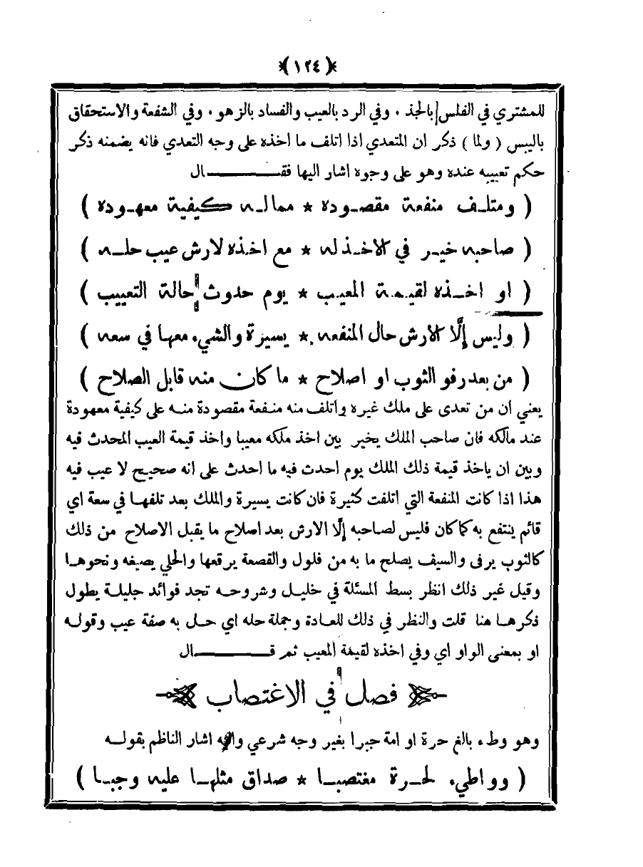 يعني أن من تعدى على ملك غيره وأتلف منه منفعة مقصودة منه على كيفية معهودة عند مالكه فإن صاحب الملك يخير بين أخذ ملكه معيبًا وأخذ قيمة العيب المحدث فيه وبين أن يأخذ قيمة ذلك الملك يوم أحدث فيه ما أحدث على أنه صحيح لا عيب فيه هذا إذا كانت المنفعة التي أتلفت كثيرة فإن كانت يسيرة والملك بعد تلفها في سعة أي قائم ينتفع به كما كان فليس لصاحبه إلا الأرش بعد إصلاح ما يقبل الإصلاح من ذلك كالثوب يرفى والسيف يصلح ما به من فلول والقصعة يرقعها والحلي يصبغه ونحوها وقيل غير ذلك أنظر بسط المسألة في خليل وشروحه تجد فوائد جليلة يطول ذكرها هنا قلت والنظر في ذلك للعادة وجملة حله إي حل به صفة عيب وقوله أو بمعنى الواو أي وفي أخذه لقيمة المعيب ثم قال