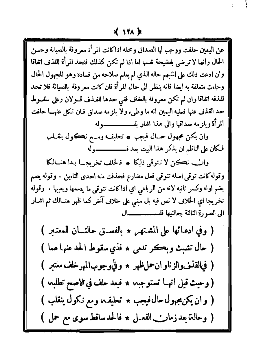 (حال تشبث وبكر تدمي ... فذي سقوط الحد عنها عما)