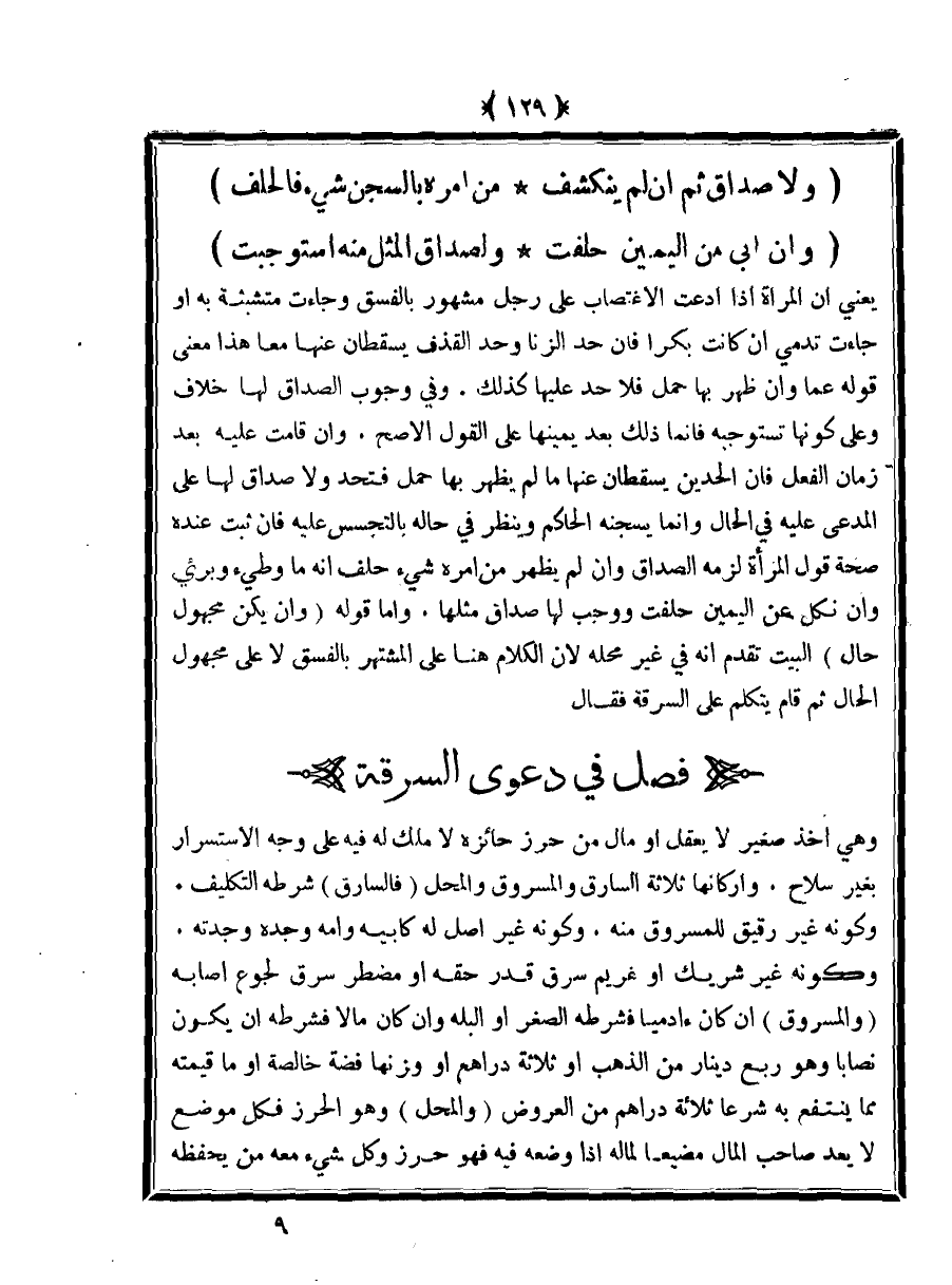 وهي أخذ صغير لا يعقل أو مال من حرز حائزه لا ملك له فيه على وجه الاستسرار بغير سلاح. وأركانها ثلاثة السارق والمسروق والمحل (فالسارق) شرطه التكليف. وكونه غير رقيق للمسروق منه. وكونه غير أصل له كأبيه وأمه وجده وجدته. وكونه غير شريك أو غريم سرق قدر حقه أو مضطر سرق لجوع أصابه (والمسروق) إن كان أدميا فشرطه الصغر أو البله وإن كان مالًا فشرطه أن يكون نصابا وهو ربع دينار من الذهب أو ثلاثة دراهم أو وزنها فضة خالصة أو ما قيمته مما ينتفع به شرعا ثلاثة دراهم من العروض (والمحل) وهو الحرز فكل موضع لا يعد صاحب المال مضيعًا لماله إذا وضعه فيه فهو حرز وكل شيء معه من يحفظه