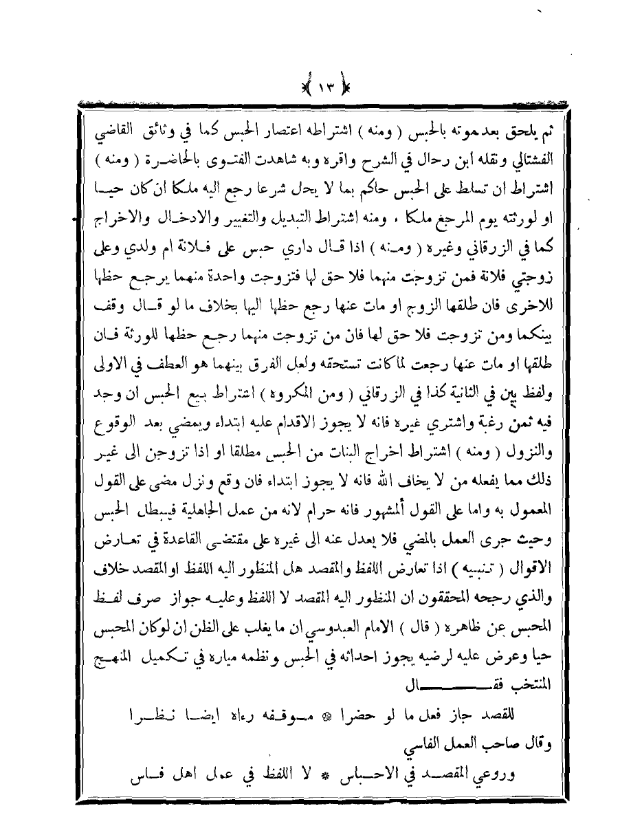 ثم يلحق بعد موته بالحبس (ومنه) اشتراطه اعتصار الحبس كما في وثائق القاضي الفشتالي ونقله ابن رحال في الشرح واقره وبه شاهدت الفتوى بالحاضرة (ومنه) اشتراط أن تسلط على الحبس حاكم بما لا يحل شرعا رجع إليه ملكا إن كان حيًا أو لورثته يوم المرجع ملكا. ومنه اشتراط التبديل والتغيير والإدخال والإخراج كما في الزرقاني وغيره (ومنه) إذا قال داري حبس على فلانة أم ولدي وعلى زوجتي فلانة فمن تزوجت منهما فلا حق لها فتزوجت واحدة منهما يرجع حظها للأخرى فإن طلقها الزوج أو مات عنها رجع حظها إليها بخلاف ما لو قال وقف بينكما ومن تزوجت فلا حق لها فإن من تزوجت منهما رجع حظها للورثة فإن طلقها أو مات عنها رجعت لما كانت تستحقه ولعل الفرق بينهما هو العطف في الأولى ولفظ بين في الثانية كذا في الزرقاني (ومن المكروه) اشتراط بيع الحبس إن وجد فيه ثمن رغبة واشتري غيره فإنه لا يجوز الإقدام عليه ابتداء ويمضي بعد الوقوع والنزول (ومنه) اشتراط إخراج البنات من الحبس مطلقًا أو إذا تزوجن إلى غير ذلك مما يفعله من لا يخاف الله فإنه لا يجوز ابتداء فإن وقع ونزل مضى على القول المعمول به وأما على القول المشهور فإنه حرام لأنه من عمل الجاهلية فيبطل الحبس وحيث جرى العمل بالمضي فلا يعدل عنه إلى غيره على مقتضى القاعدة في تعارض الأقوال (تنبيه) إذا تعارض اللفظ والمقصد هل المنظور إليه اللفظ أو المقصد خلاف والذي رجحه المحققون أن المنظور إليه المقصد لا اللفظ وعليه جواز صرف لفظ المحبس عن ظاهره (قال) الإمام العبدوسي إن ما يغلب على الظن أن لو كان المحبس حيا وعرض عليه لرضيه يجوز إحداثه في الحبس ونظمه مياره في تكميل المنهج المنتخب فقال