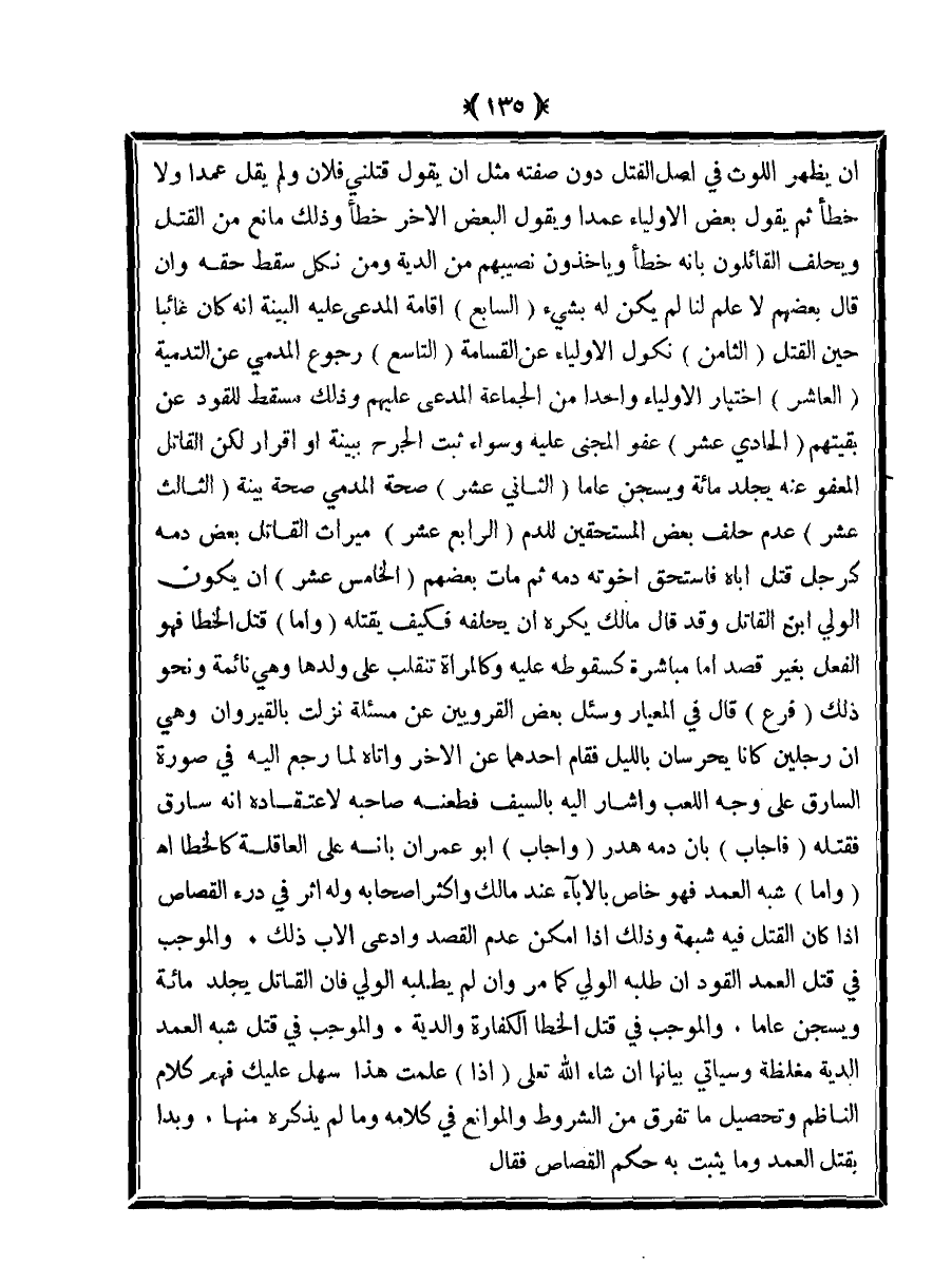 إن ظهر اللوث في أصل القتل دون صفته مثل أن يقول قتلني فلان ولم يقل عمدا ولا خطأ ثم يقول بعض الأولياء عمدا ويقول البعض الأخر خطأ وذلك مانع من القتل ويحلف القائلون بأنه خطأ ويأخذون نصيبهم من الدية ومن نكل سقط حقه وإن قال بعضهم لا علم لنا لم يكن له بشيء (السابع) إقامة المدعي عليه البينة أنه كان غائبا حين القتل (الثامن) نكول الأولياء عن القسامة (التاسع) رجوع المدمي عن التدمية (العاشر) اختيار الأولياء واحدا من الجماعة المدعي عليهم وذلك مسقط للقود عن بقيتهم (الحادي عشر) عفو المجني عليه وسواء ثبت الجرح ببينة أو أقرار لكن القاتل المعفو عنه يجلد مائة ويسجن عاما (الثاني عشر) صحة المدمي صحة بينة (الثالث عشر) عدم حلف بعض المستحقين للدم (الرابع عشر) ميراث القاتل بعض دمه كرجل قتل أباه فاستحق إخوته دمه ثم مات بعضهم (الخامس عشر) أن يكون الولي ابن القاتل وقد قال مالك يكره أن يحلفه فكيف يقتله (وأما) قتل الخطأ فهو الفعل بغير قصد أما مباشرة كسقوطه عليه وكالمرأة تنقلب على ولدها وهي نائمة ونحو ذلك (فرع) قال في المعيار وسئل بعض القرويين عن مسألة نزلت بالقيروان وهي إن رجلين كانا يحرسان بالليل فقام أحدهما عن الأخر وأتاه لما رجع إليه في صورة السارق على وجه اللعب وأشار إليه بالسيف فطعنه صاحبه لاعتقاده أنه سارق فقتله (فأجاب) بأن دمه هدر (وأجاب) أبو عمران بأنه على العاقلة كالخطأ اهـ (وأما) شبه العمد فهو خاص بالآباء عند مالك وأكثر أصحابه وله أثر في درء القصاص إذا كان القتل فيه شبهة وذلك إذا أمكن عدم القصد وأدعى الأب ذلك. والموجب في قتل العمد القود إن طلبه الولي كما مر وإن لم يطلبه الولي فإن القاتل يجلد مائة ويسجن عاما. والموجب في قتل الخطأ الكفارة والدية. والموجب في قتل شبه العمد الدية مغلظة وسيأتي بيانها إن شاء الله تعالى (إذا) علمت هذا سهل عليك فهم كلام الناظم وتحصيل ما تفرق من الشروط والموانع في كلامه وما لم يذكره منها. وبدا بقتل العمد وما يثبت به حكم القصاص فقال