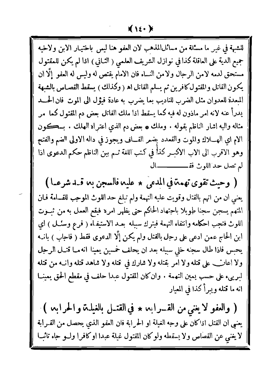 للشبهة في غير ما مسئلة من مسائل المذهب لأن العفو هنا ليس باختيار الابن ولأخيه جميع الدية على العاقلة كذا في نوازل الشريف العلمي (الثاني) إذا لم يكن للمقتول مستحق لدمه لا من الرجال ولا من النساء فإن الإمام يقتص له وليس له العفو إلا أن يكون القاتل والمقتول كافرين ثم يسلم القاتل أهـ (وكذلك) يسقط القصاص بالشبهة المبعدة للعدوان مثل الضرب للتأديب بما يضرب به عادة فيؤل إلى الموت فإن الحد يدرأ عنه لأنه أمر مأذون له فيه كما يسقط إذا ملك القاتل بعض دم المقتول كما مر مثاله وإليه أشار الناظم بقوله. وملك * بعض دم الذي اعتراه الهلك. بسكون ألام أي الهلاك والموت والقعدد بضم القاف ويجوز في داله الأولى الضم والفتح وهو الأقرب إلى الأب الأكبر كذا في كتب اللغة ثم بين الناظم حكم الدعوى إذا لم تصل حد اللوث فقال