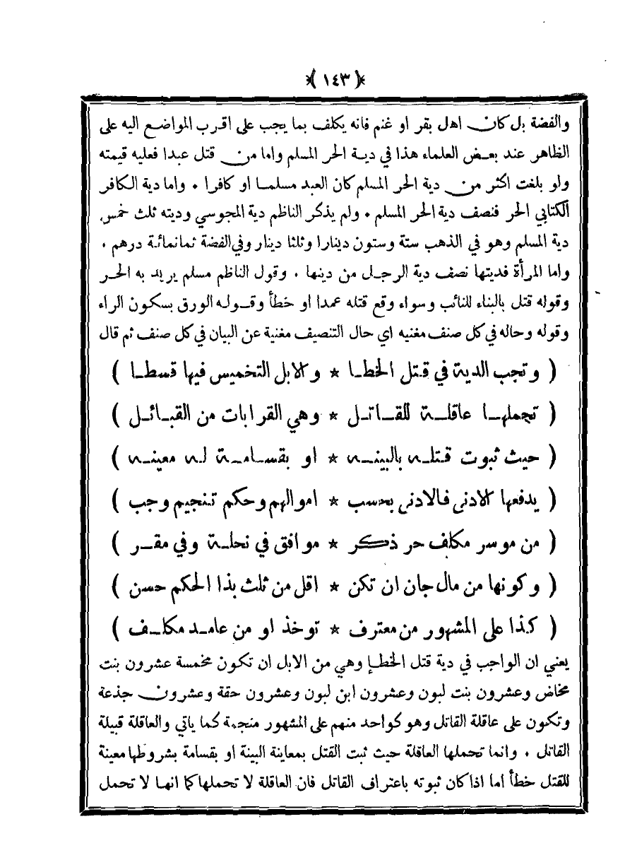 والفضة بل كان أهل بقر أو غنم فإنه يكلف بما يجب على أقرب المواضع إليه على الظاهر عند بعض العلماء هذا في دية الحر المسلم وأما من قتل عبدا فعليه قيمته ولو بلغت أكثر من دية الحر المسلم كان العبد مسلما أو كافرا. وأما دية الكافر الكتابي الحر فنصف دية الحر المسلم. ولم يذكر الناظم دية المجوسي وديته ثلث خمس دية المسلم وهو في الذهب ستة وستون دينارا وثلثا دينار وفي الفضة ثمانمائة درهم، وأما المرأة فديتها نصف دية الرجل من دينها. وقول الناظم مسلم يريد به الحر وقوله قتل بالبناء للنائب وسواء وقع قتله عمدا أو خطأ وقوله الورق بسكون الراء وقوله وحاله في كل صنف مغنية أي حال التنصيف مغنية عن البيان في كل صنف ثم قال